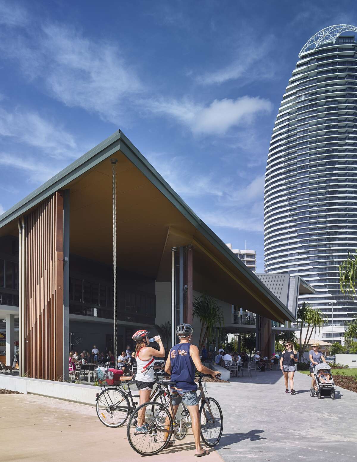 In addition to the outdoor room and café, the public front door, lounge bar deck, and dining room are located to generate activity and interest within the public domain including a connection back to the Broadbeach Mall beyond.