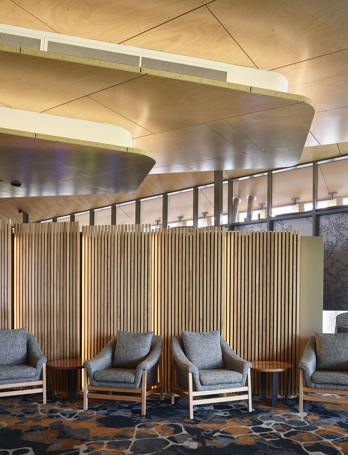 The sculpted roof, with a dynamic uplit sunscreen, defines the spatial experience whilst metaphorically alluding to beach umbrellas, sand dunes, or waves.