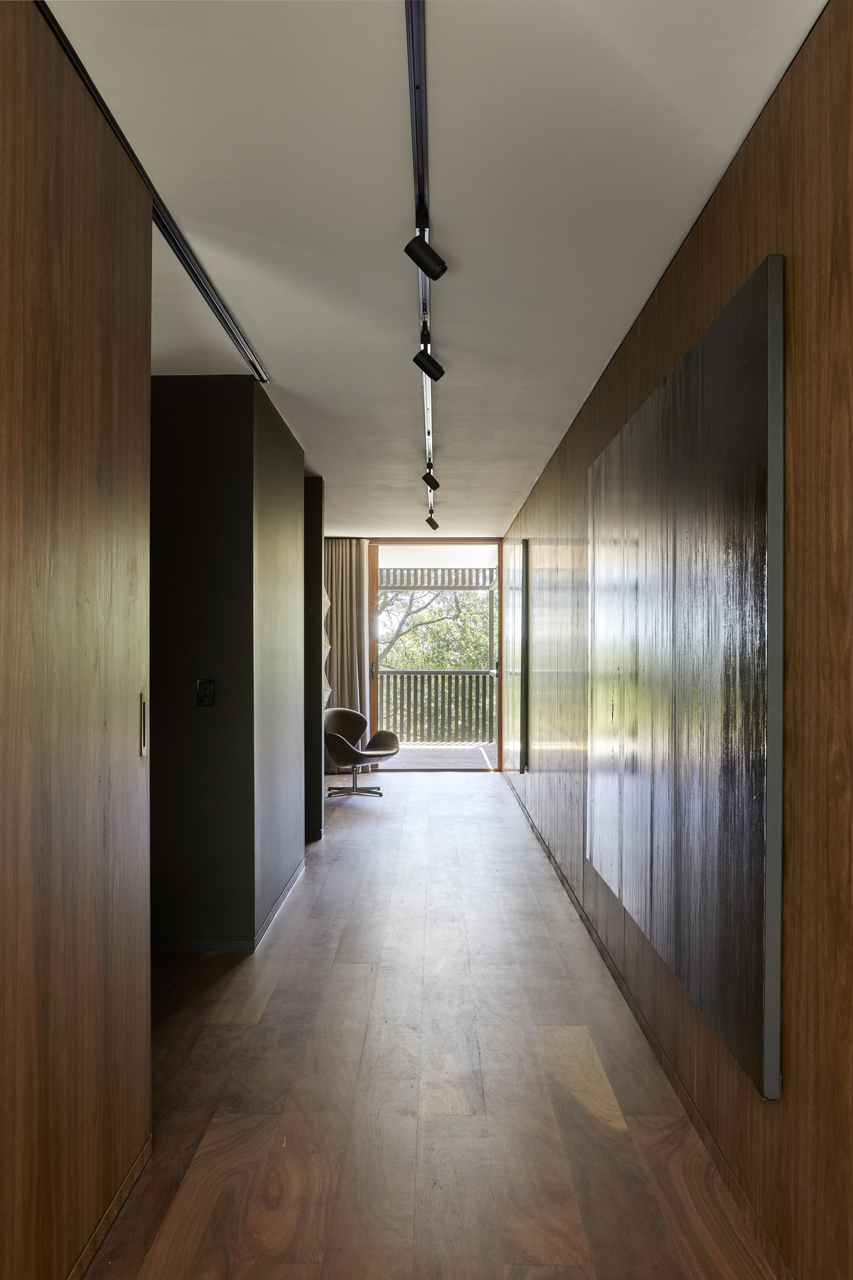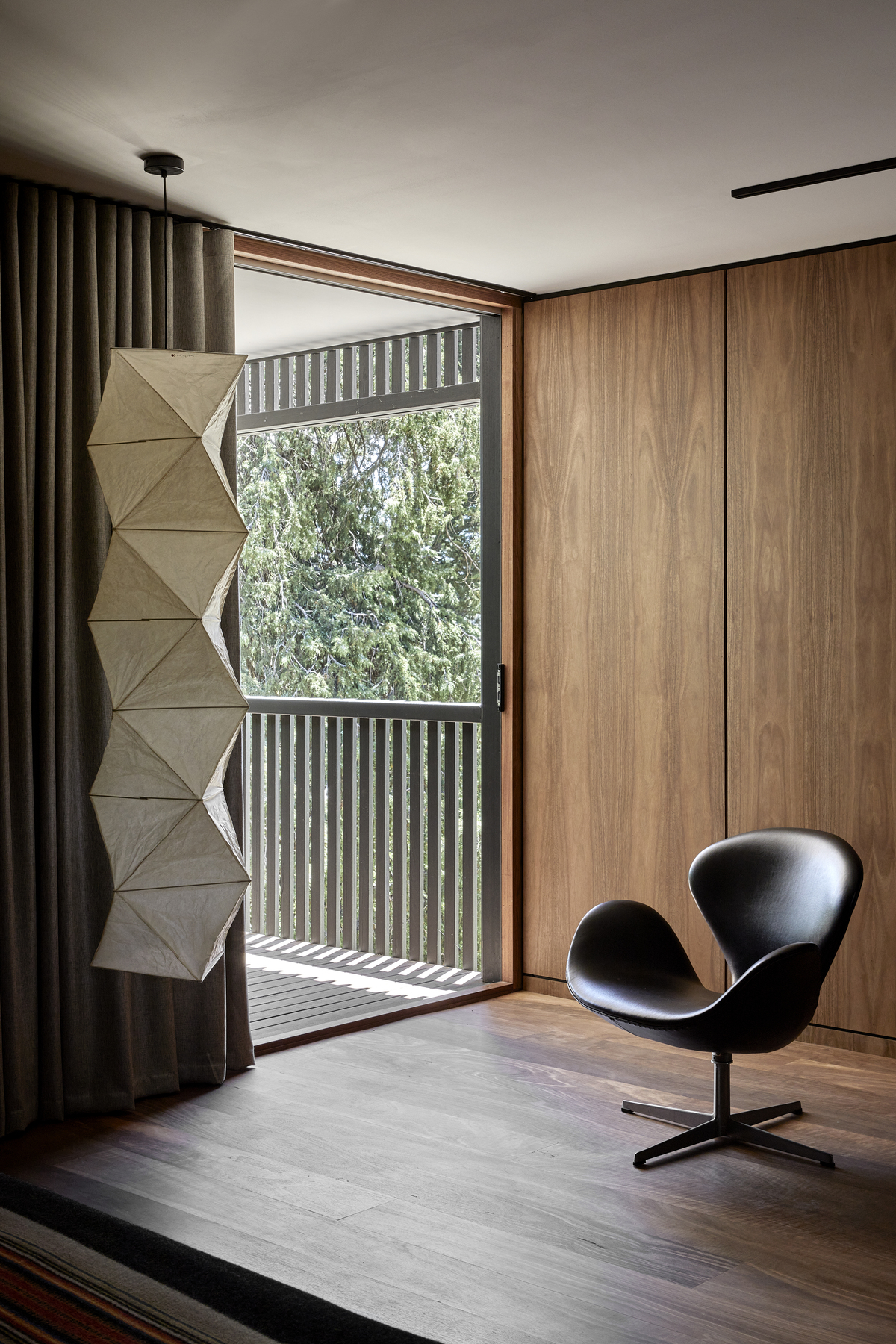 The rich materiality of the interior, with the extensive use of timber panels creating a calming and dramatic space, is especially pleasing to the Kyneton House owners.
