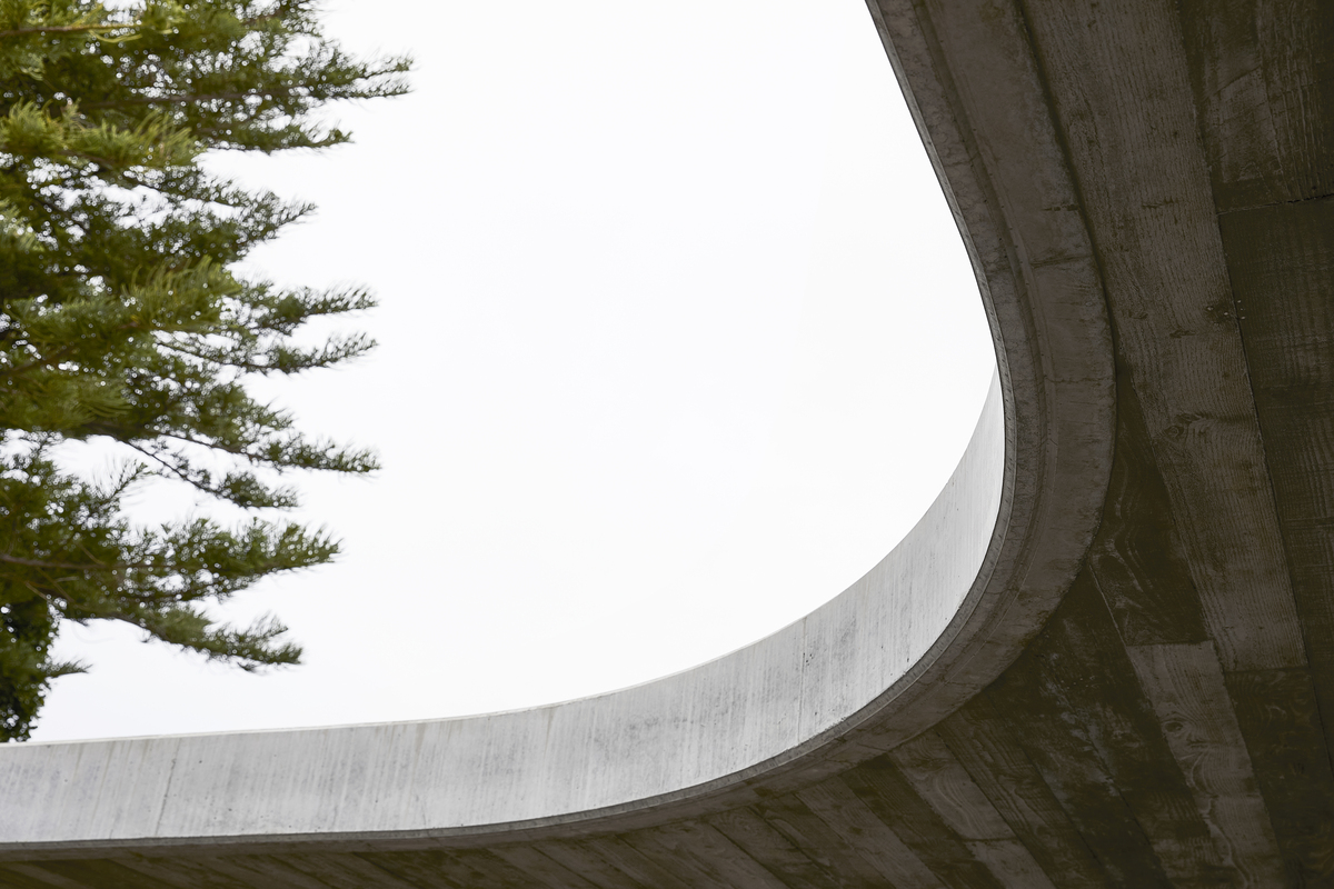 This gesture is then reflected and enhanced at the rear of the house by a board-form concrete green roof featuring a curved fascia edge that gently frames the landscaping below and brings a soft fluidity to exterior forms.