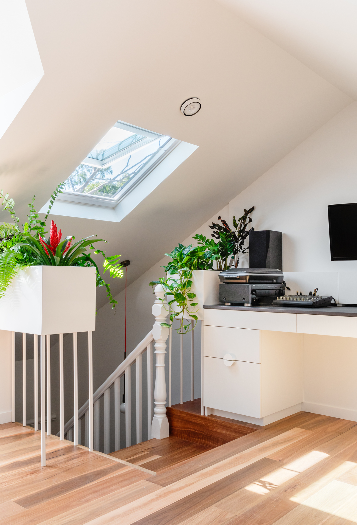 The result is a balanced, wonderfully radiant space that helps ventilate the house below and provides an inspiring environment to work from home.