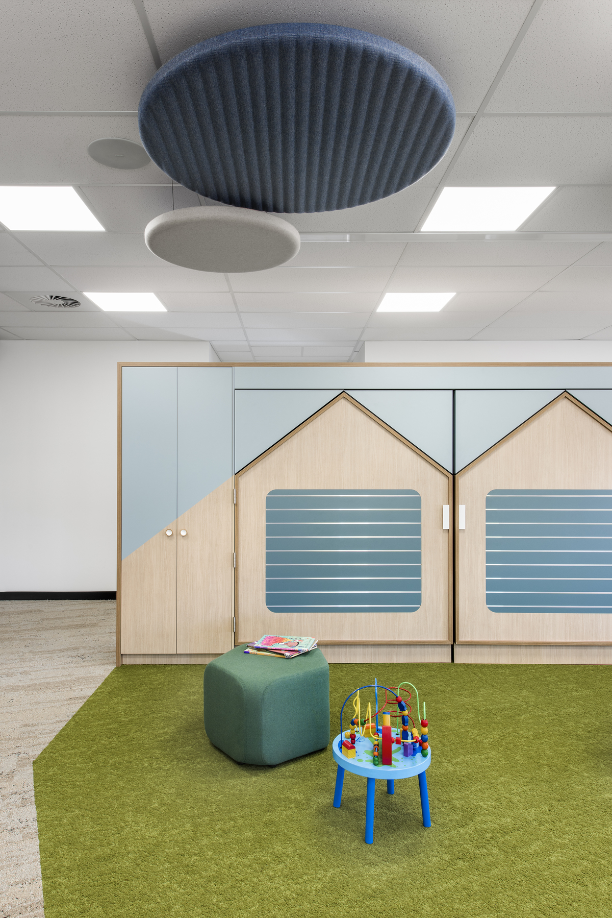 Internally, green carpet and timber-lined ceilings alongside the windows connect with the parkland, while white ceilings deep within the building create a lighter and brighter space.