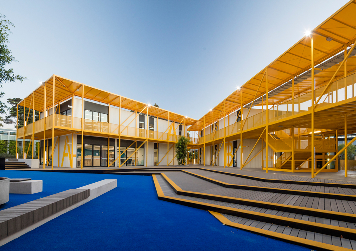 This project, designed by JCB Architects, is a vibrant temporary decanting facility with a three to five year lifespan, allowing refurbishment of other Monash College buildings during a high growth period, to then be dismantled to return the site back to a carpark.