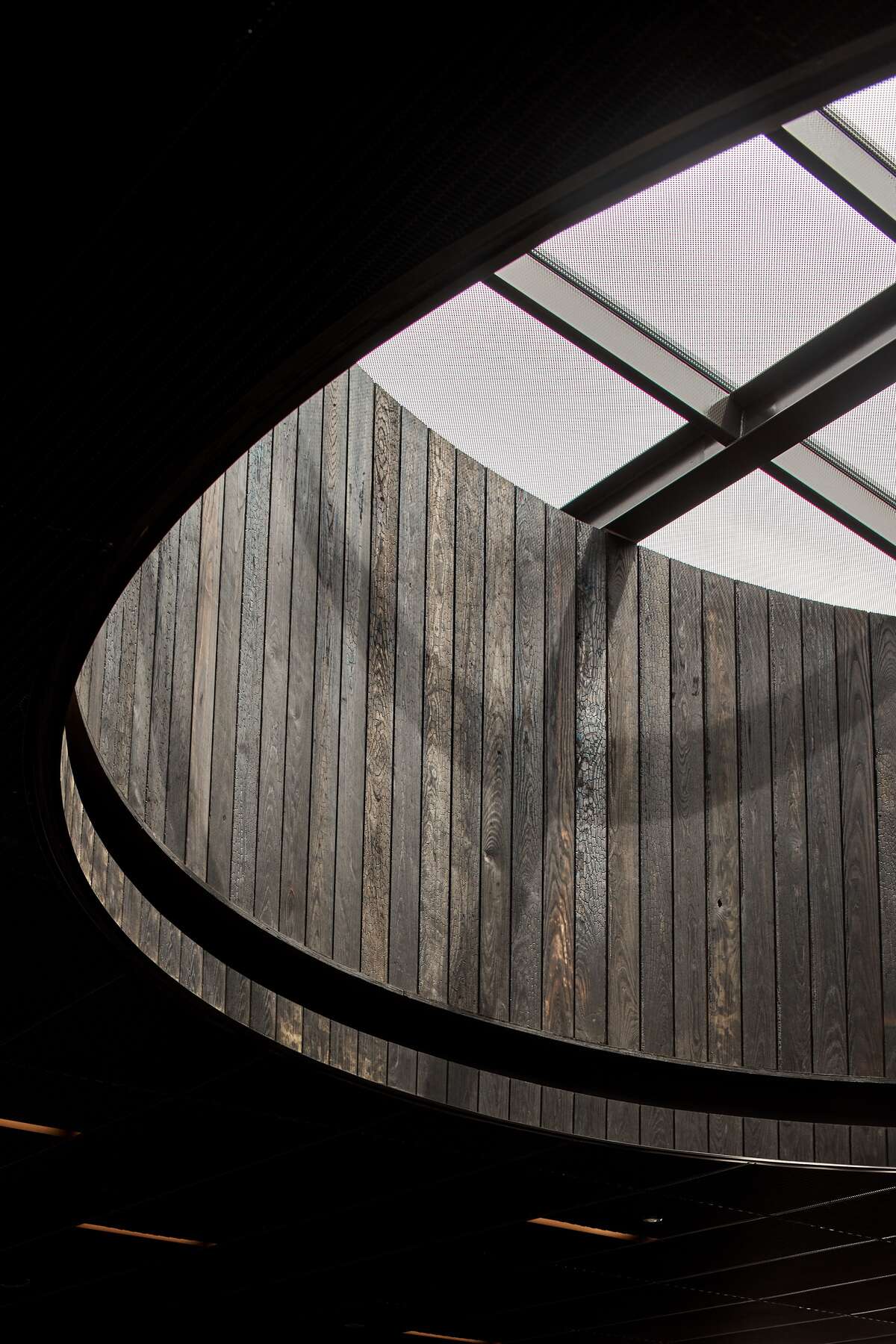 Lined in charred timber and surrounded by a curtilage of expanded black mesh, daylight will filter through the hole and create a dramatic and unexpected atmosphere.