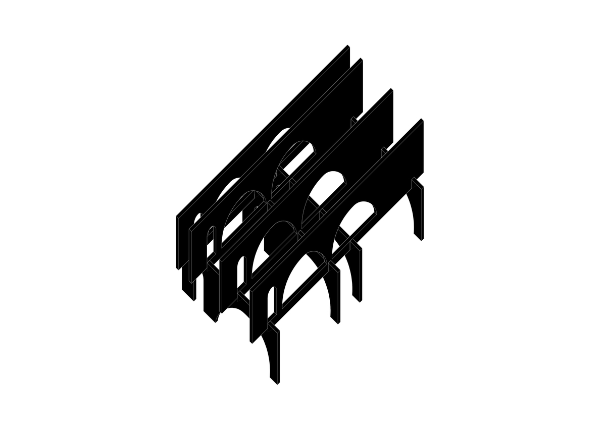Each panel is punctuated with one of two types of arch, a grand arch, and a pedestrian arch.