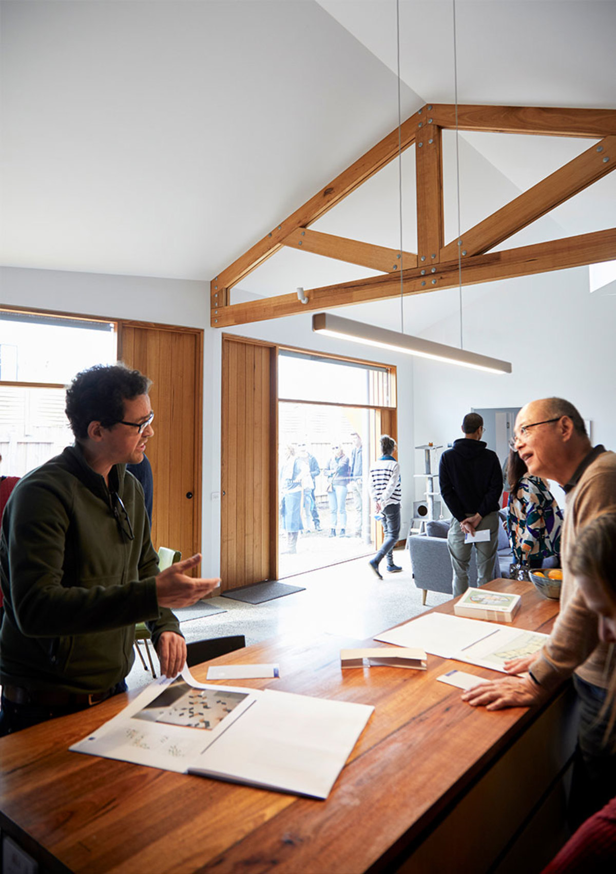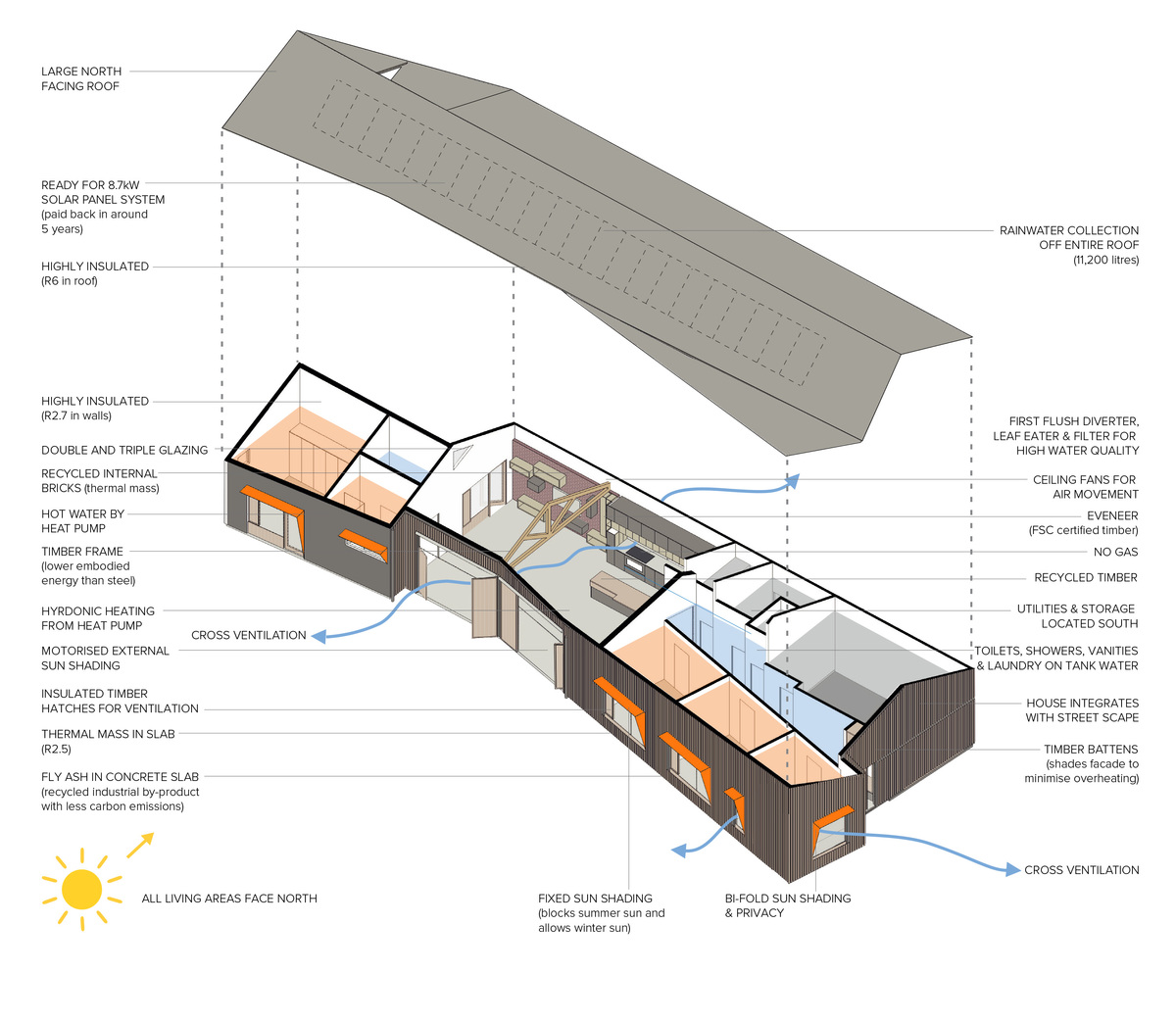 The materials were chosen for optimum thermal performance and low embodied energy where possible: timber trusses instead of structural steel, recycled brick, FSC certified timbers, double and triple glazed windows and insulated hatches.