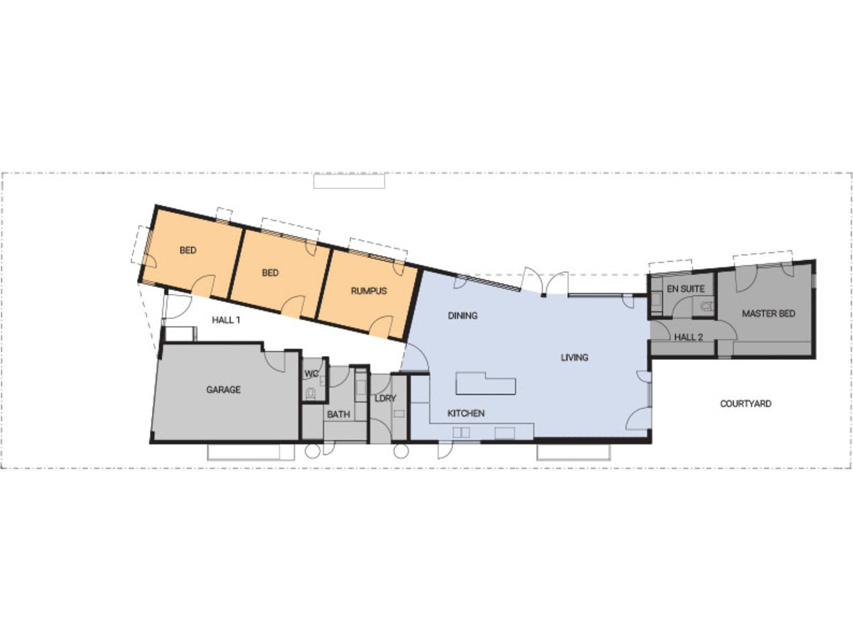But a simple twist in plan, roof overhangs and expressive sun shading give it a generosity like that of a Californian Bungalow.