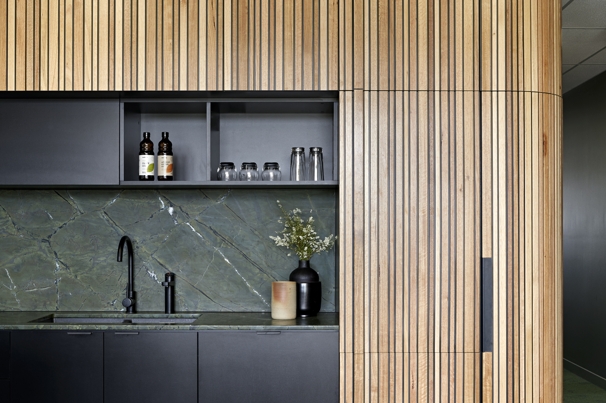 These elements ebb and flow around the interior, informing the selection of finishes and materials and even inspiring naturally undulating floors.