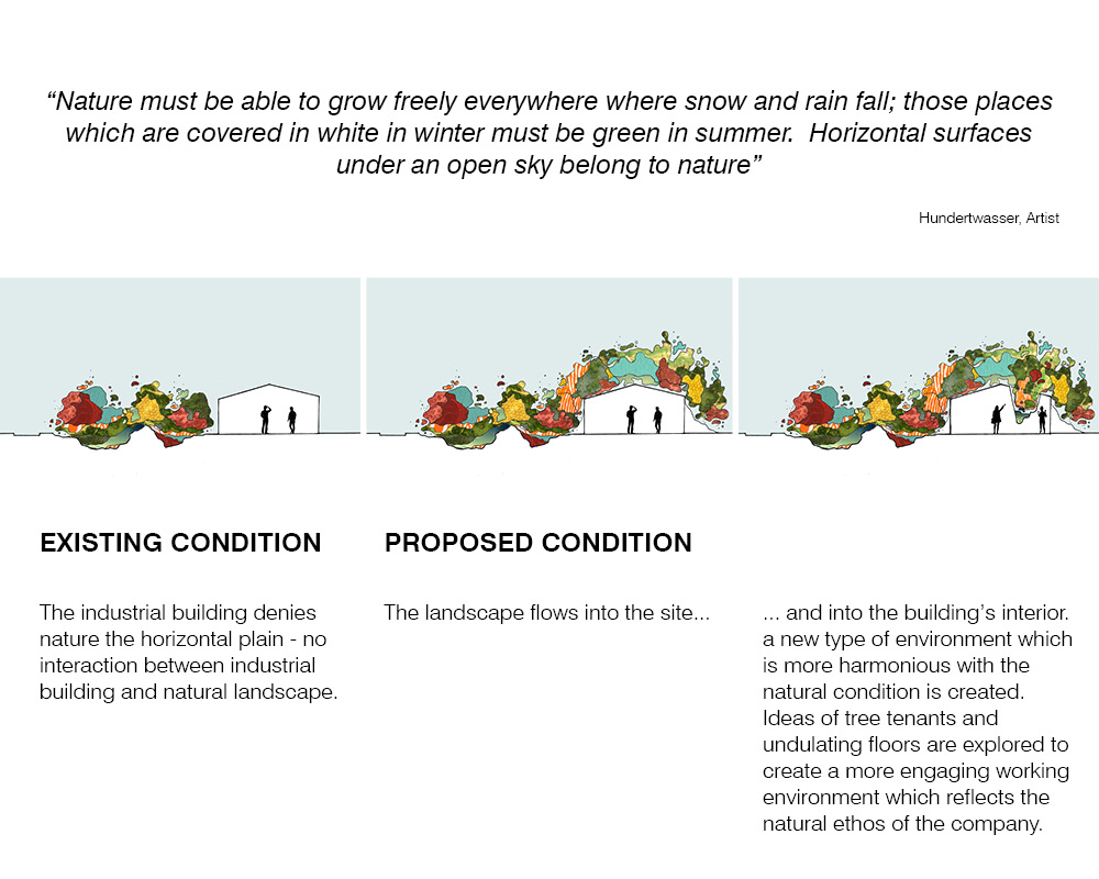 It takes the spirit of the surrounding natural world and weaves it through the interior of an existing warehouse shell.
