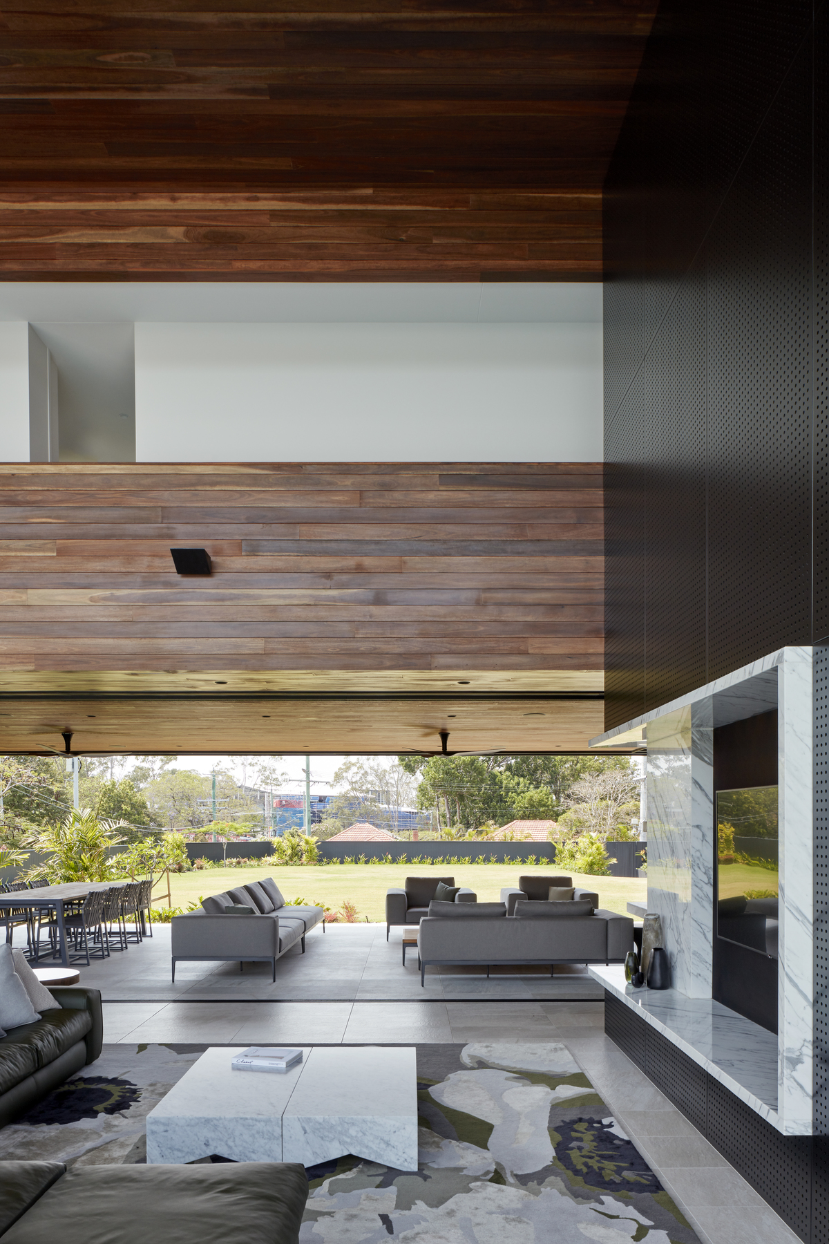 It has a 17 metre opening with sliding doors adjacent to the pool, a 10 metre opening to an outdoor room with a fireplace, and 4.6 x 5.4 metre window above the kitchen breakfast bench.