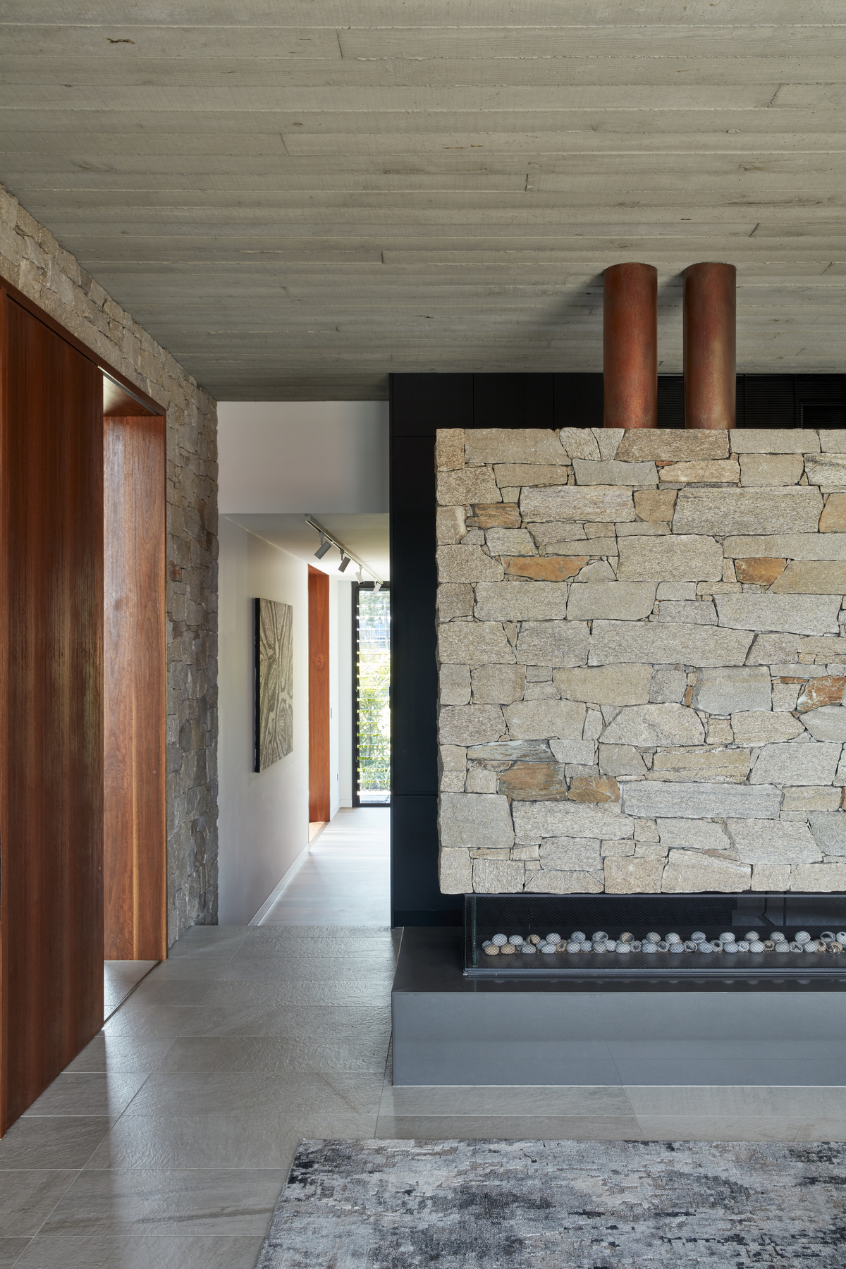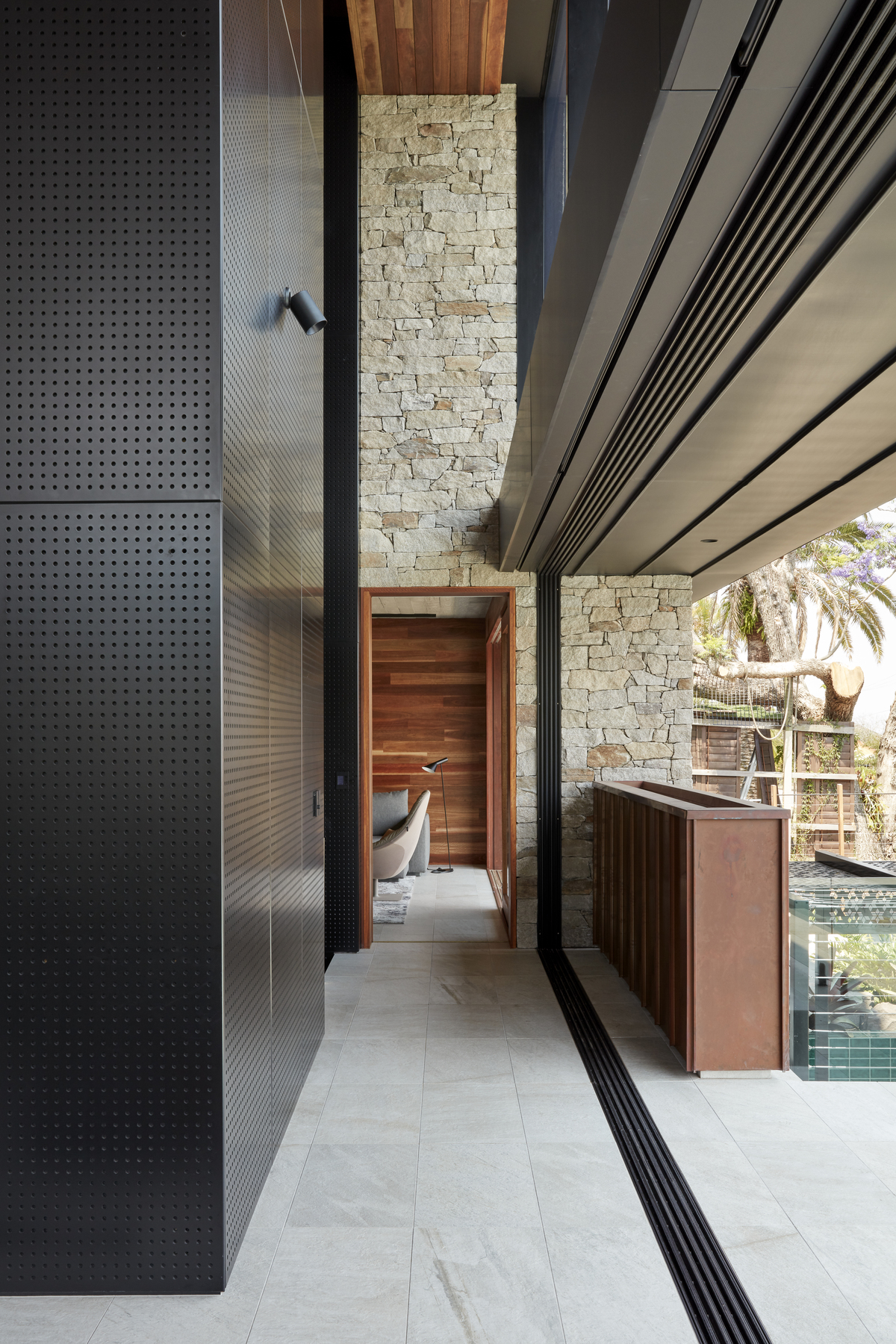 A corridor leading to children’s bedrooms overlooks this volume and provides connectivity between levels.