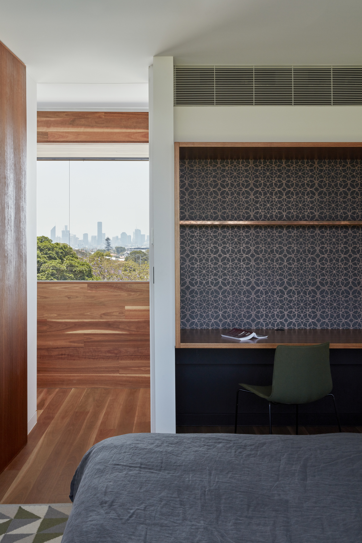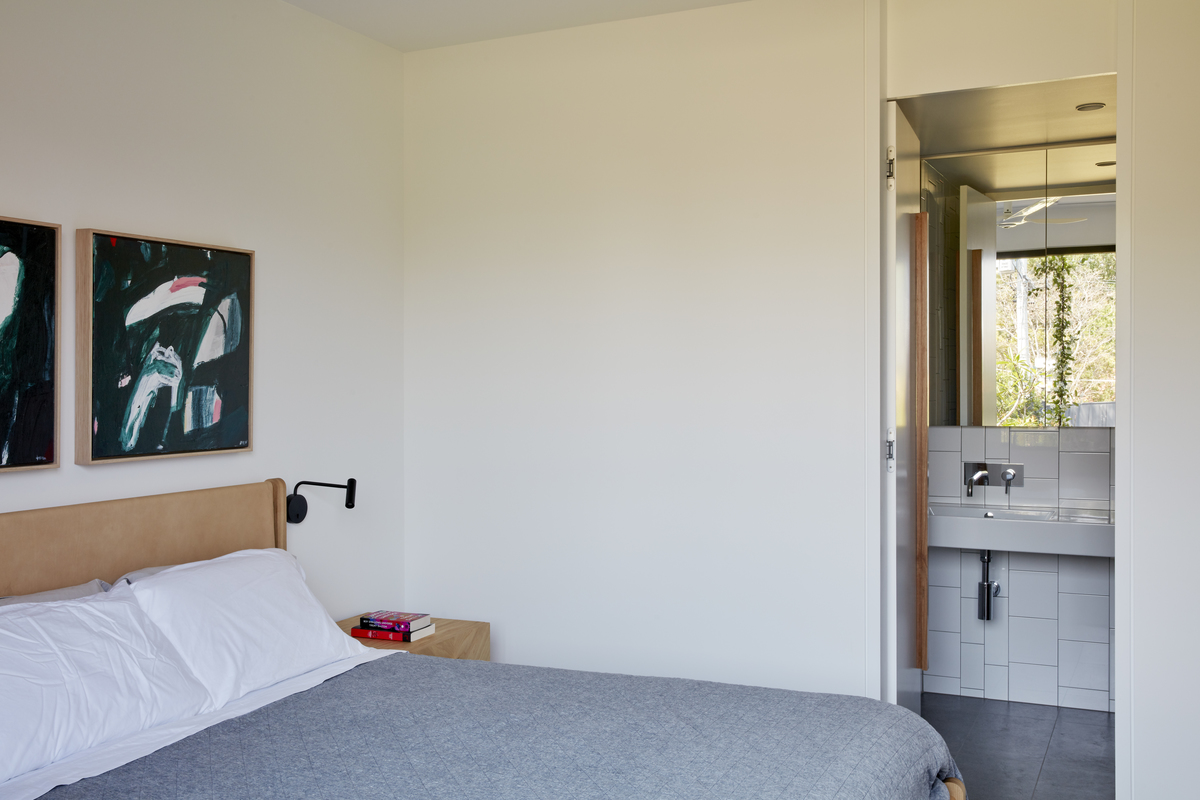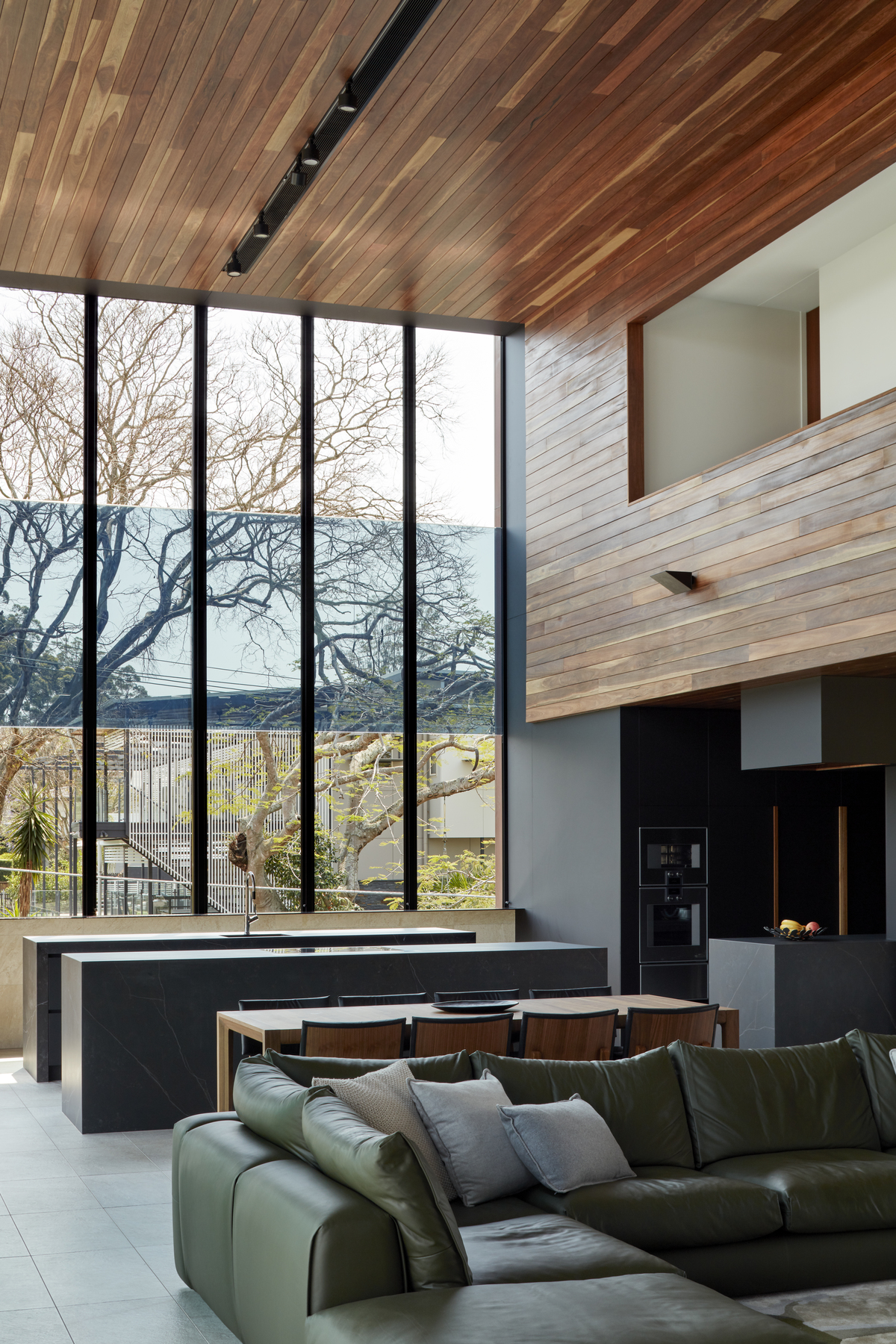 The kitchen and main living zone capitalise on a north-east aspect through the creation of a double-height volume with large operable openings.