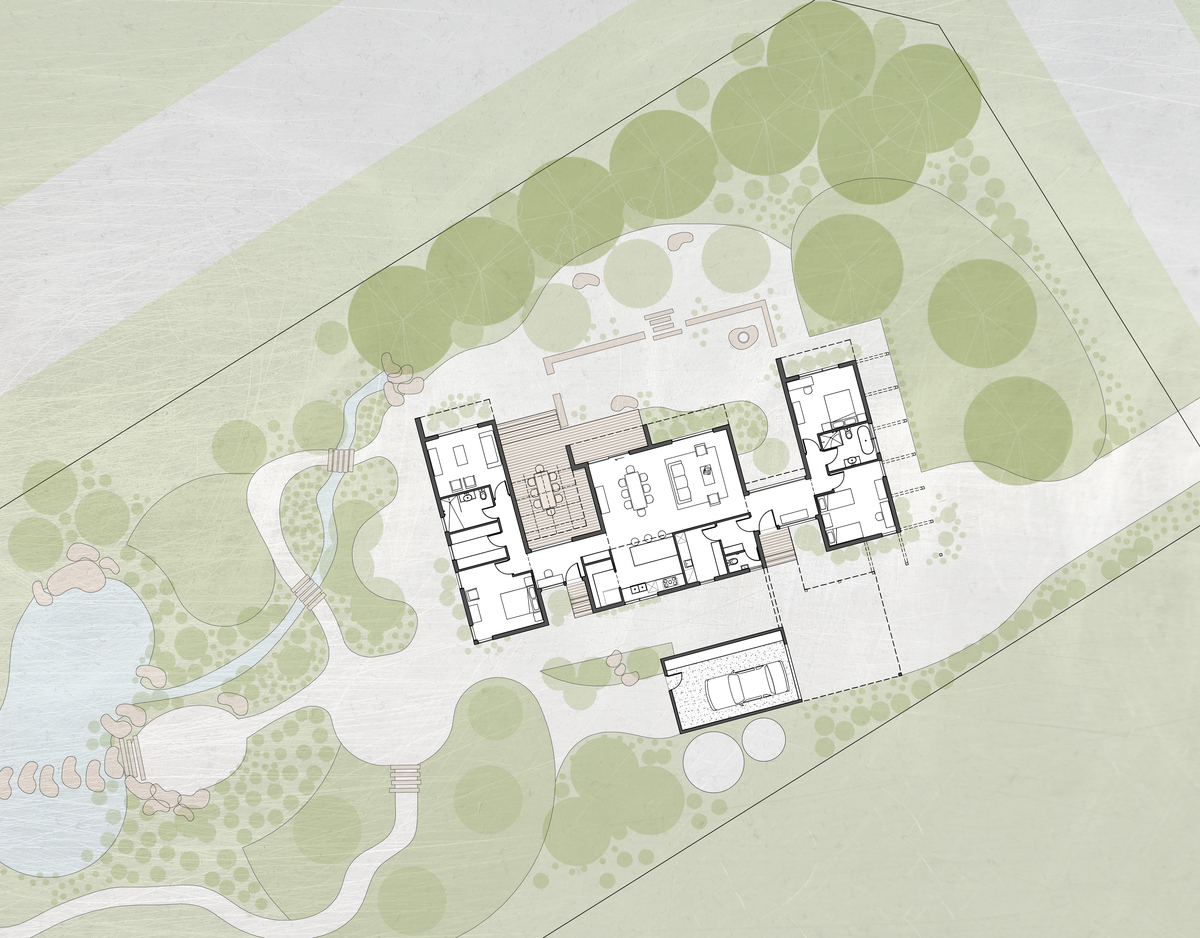 The orientation of the house is slightly north-west due to the ‘building envelope’ specified for the site – in response the roofs fold down on the western sides, forming wings to shelter each pavilion from afternoon summer sun.
