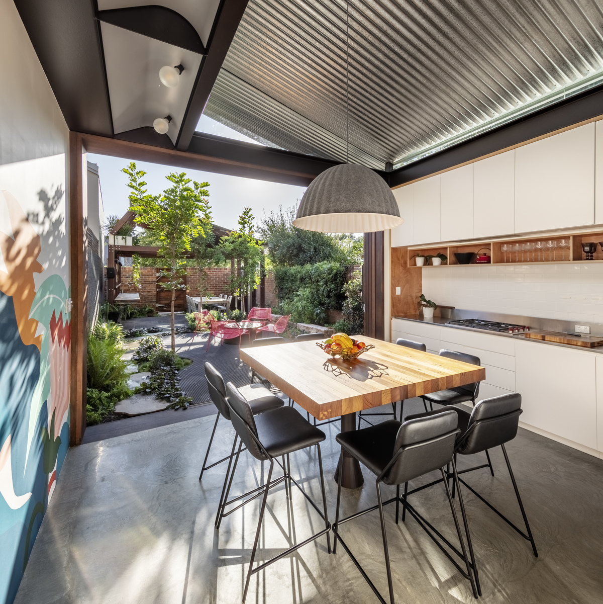 Living, dining, and kitchen spaces are integrated to this second pavilion beneath the striking skillion roof, making efficient use of the tight floor space.
