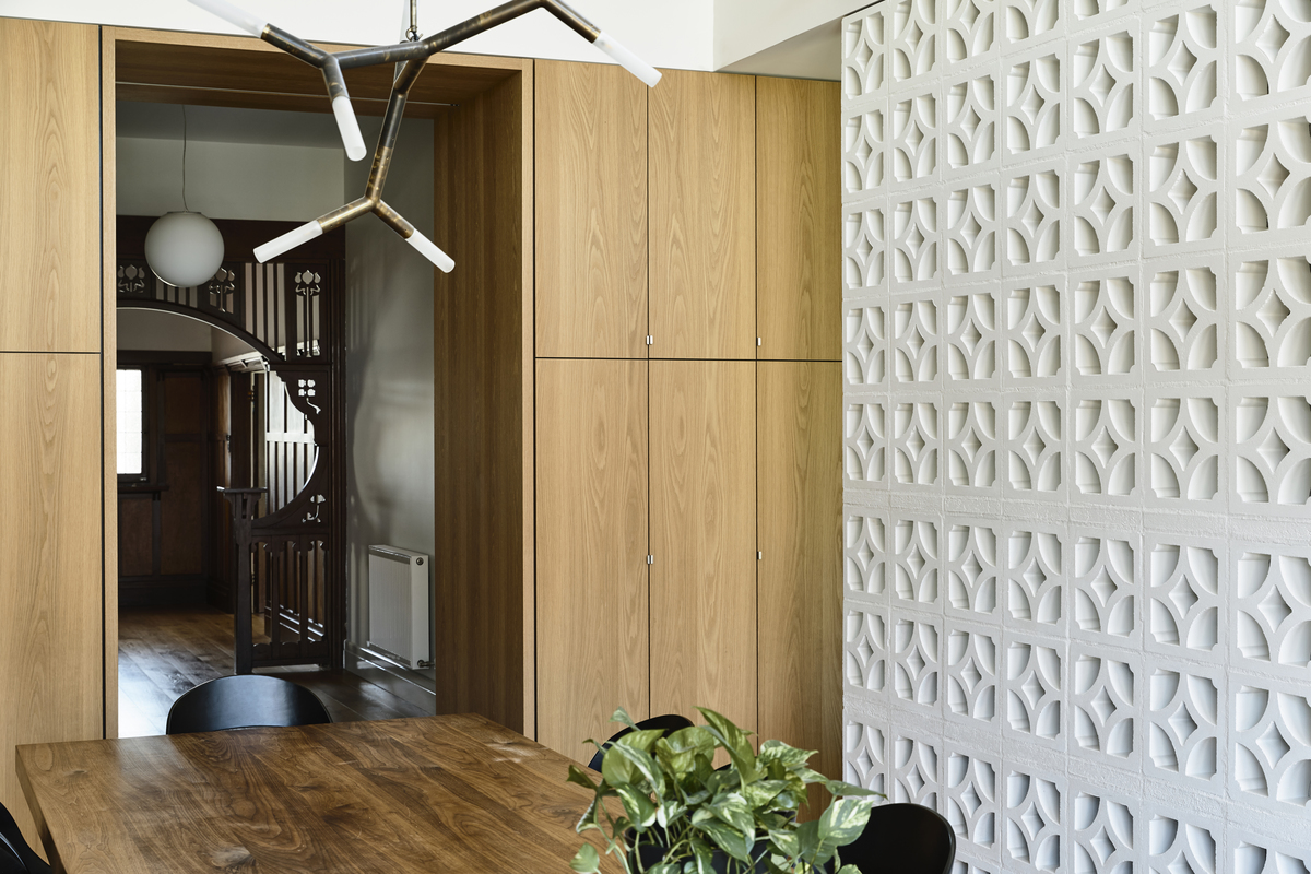 A decorative breeze block wall was located between the living and dining space to create spatial separation. The breeze block wall, which subtly references the timber detailing patterns from the existing hallway, filters light and sight lines between the kitchen-dining and family room.