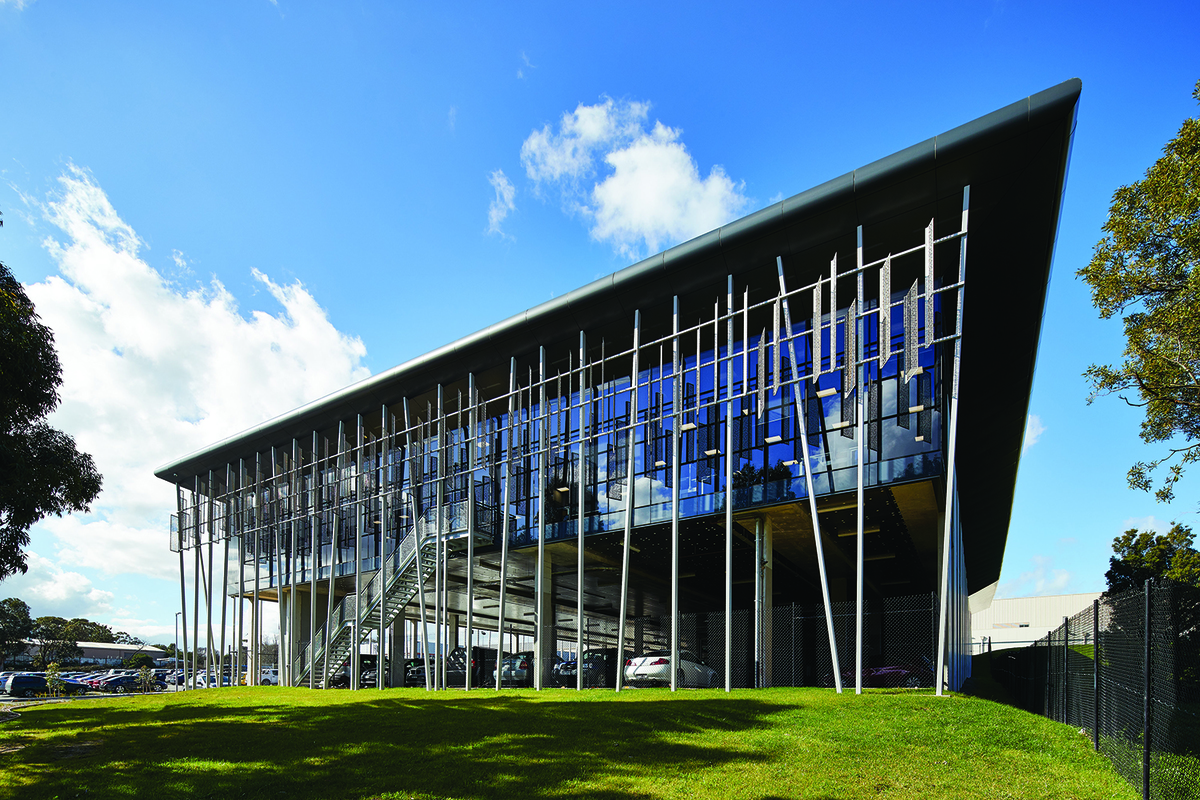 This striking office building designed by Gray Puksand for Charter Hall sits comfortably in its verdant surrounds.