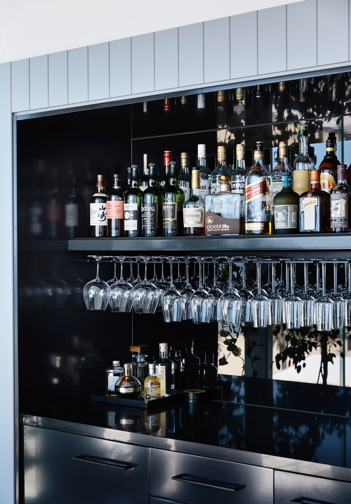 A focus on lifestyle ergonomics drove the programmatic brief: the rhomboidal joinery island in chiselled slices of timber and granite acts as a fulcrum between the kitchen and bar nearby – a nod to the marriage of food and beverage – while a new scullery is tucked out of view, allowing visible kitchen surfaces to remain pristine and presentable.