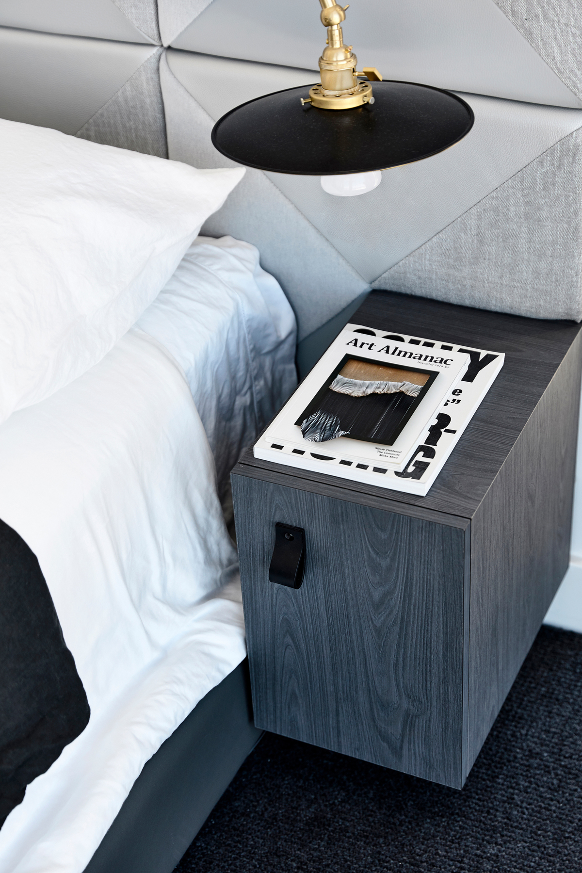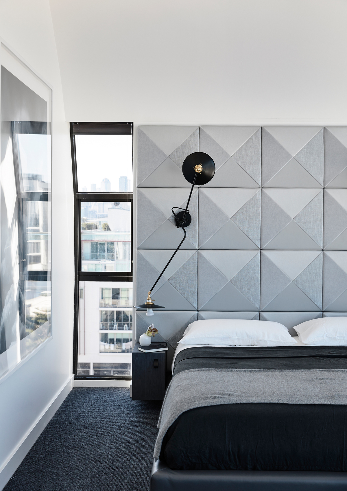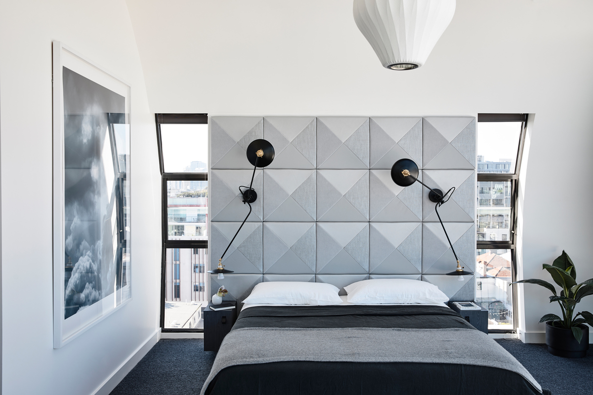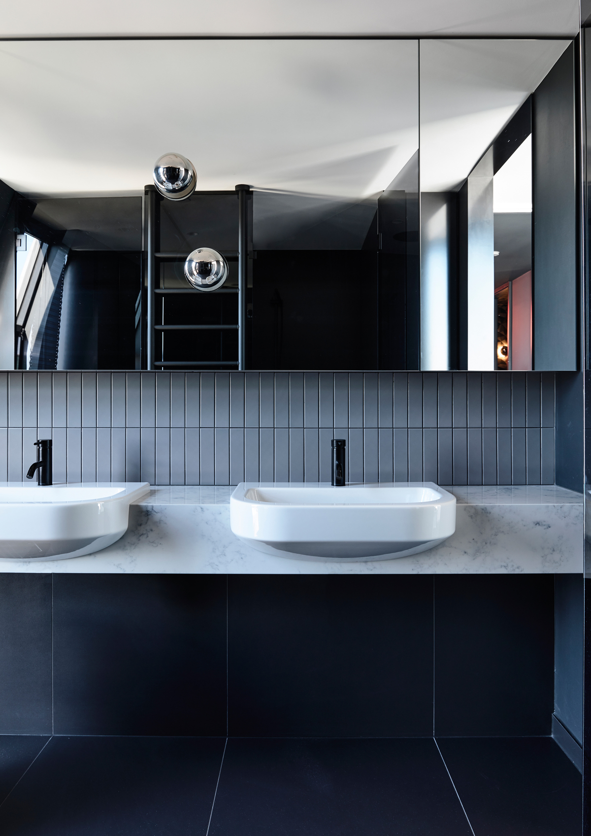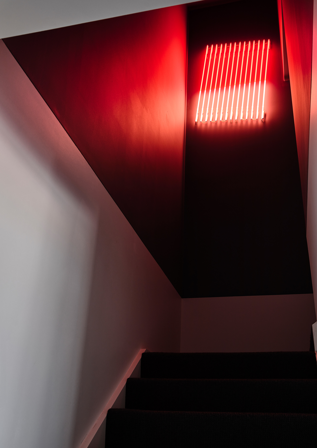 Leading upstairs to the two bedroom suites is a dramatic charcoal painted stair void topped with a commissioned pink and red neon artwork, ‘Corrected Horizon’ by Sydney-based artist Brendan Van Hek.