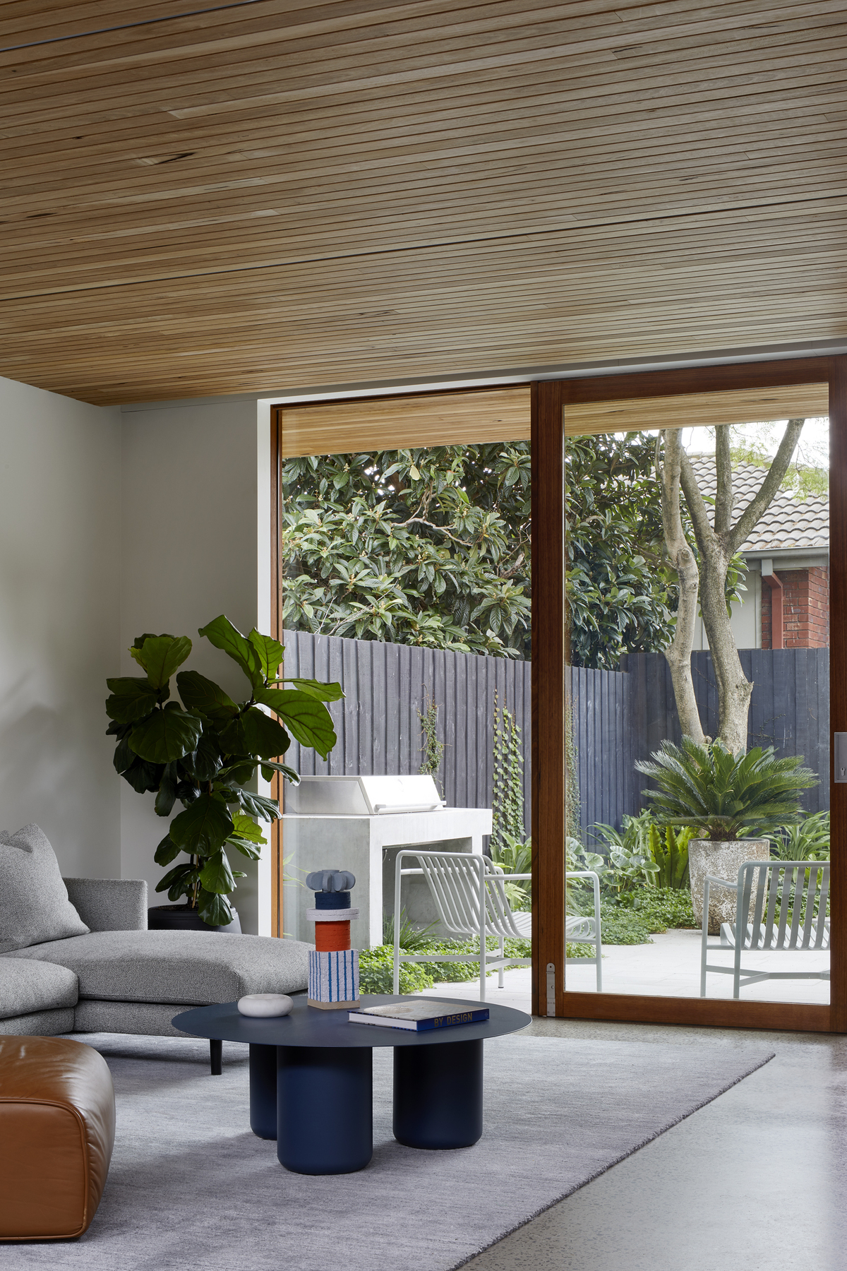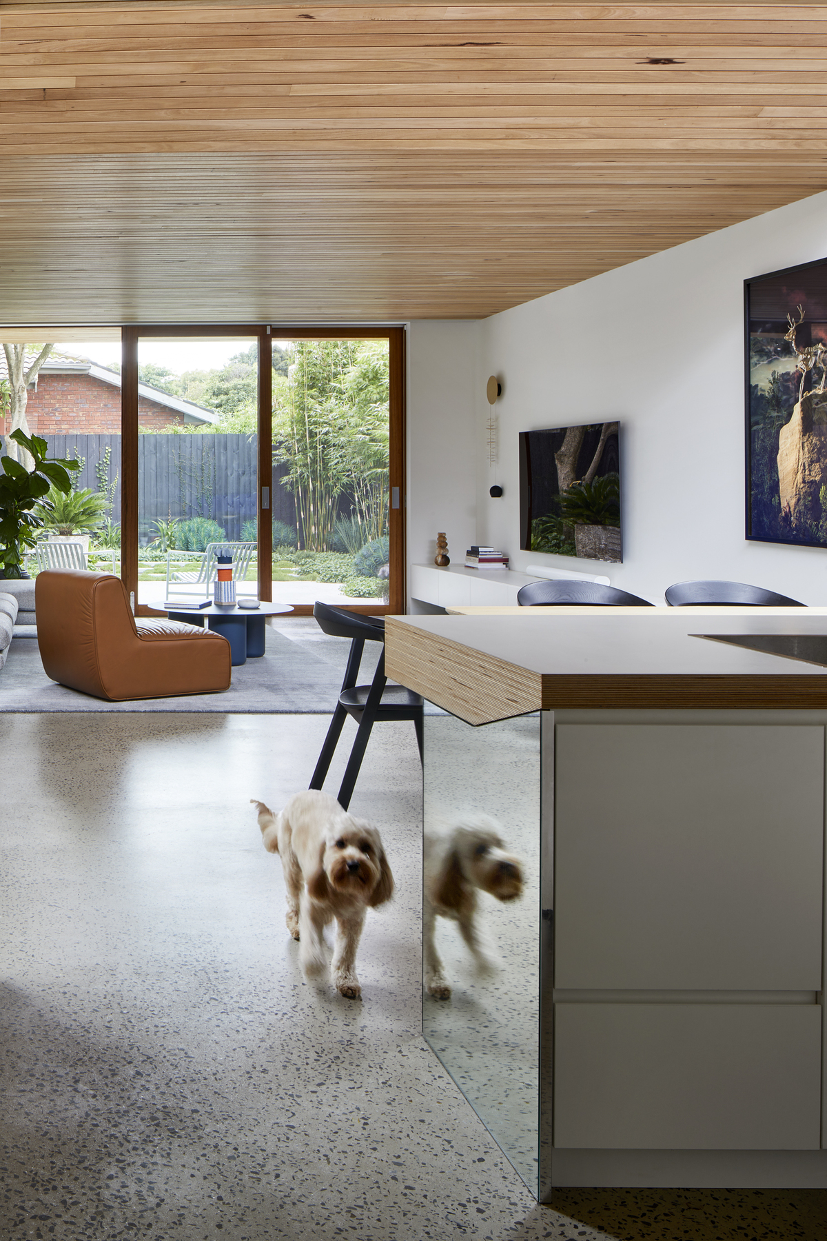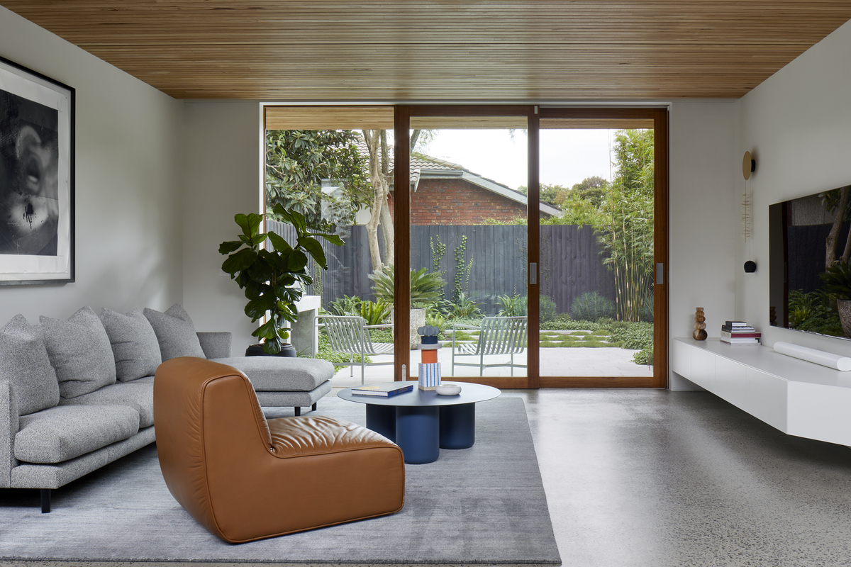 Descending through the space, a distinct shiplap-lined ceiling connects the living to the backyard beyond, contrasting against the subtle white finish of the interior walls.