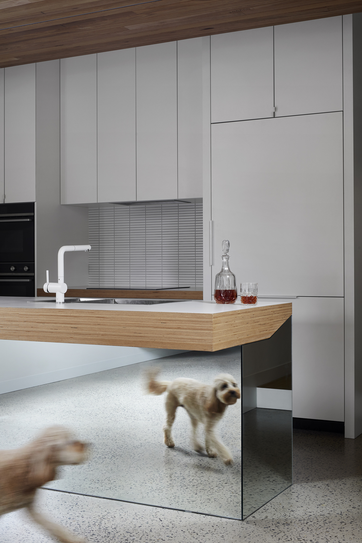 A striking kitchen bench mirrors this interior, reflecting the perception of continuity, and allowing light to deflect around its perimeter.