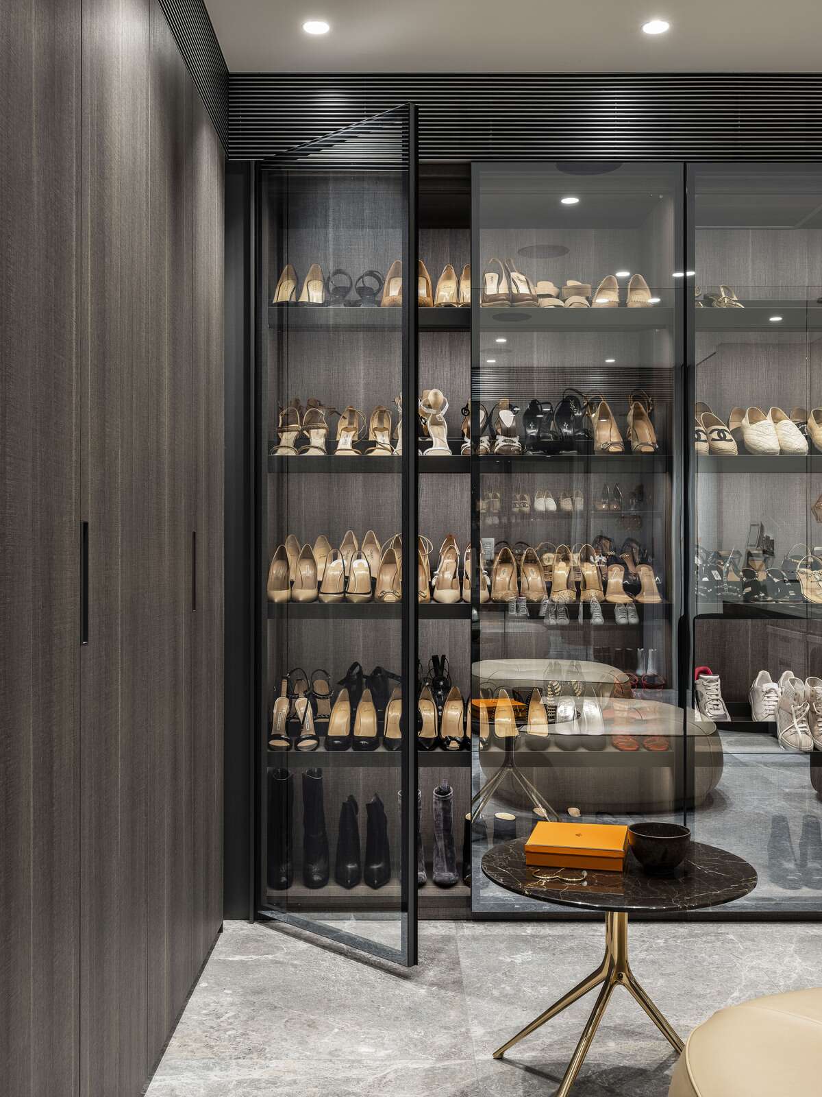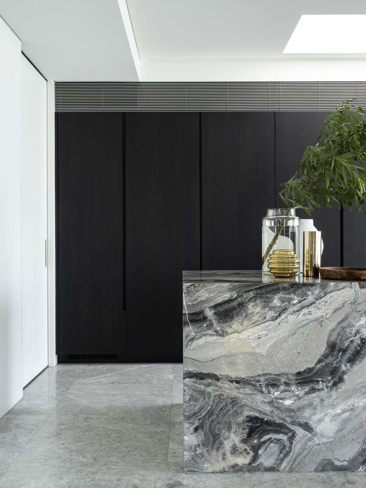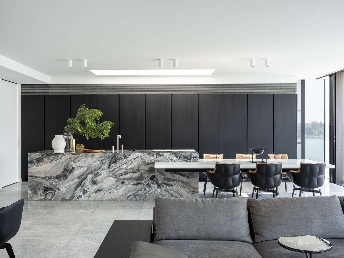 The KA Design Studio team paralleled hard stones and concrete with light timber screens and full-height glass sections.
