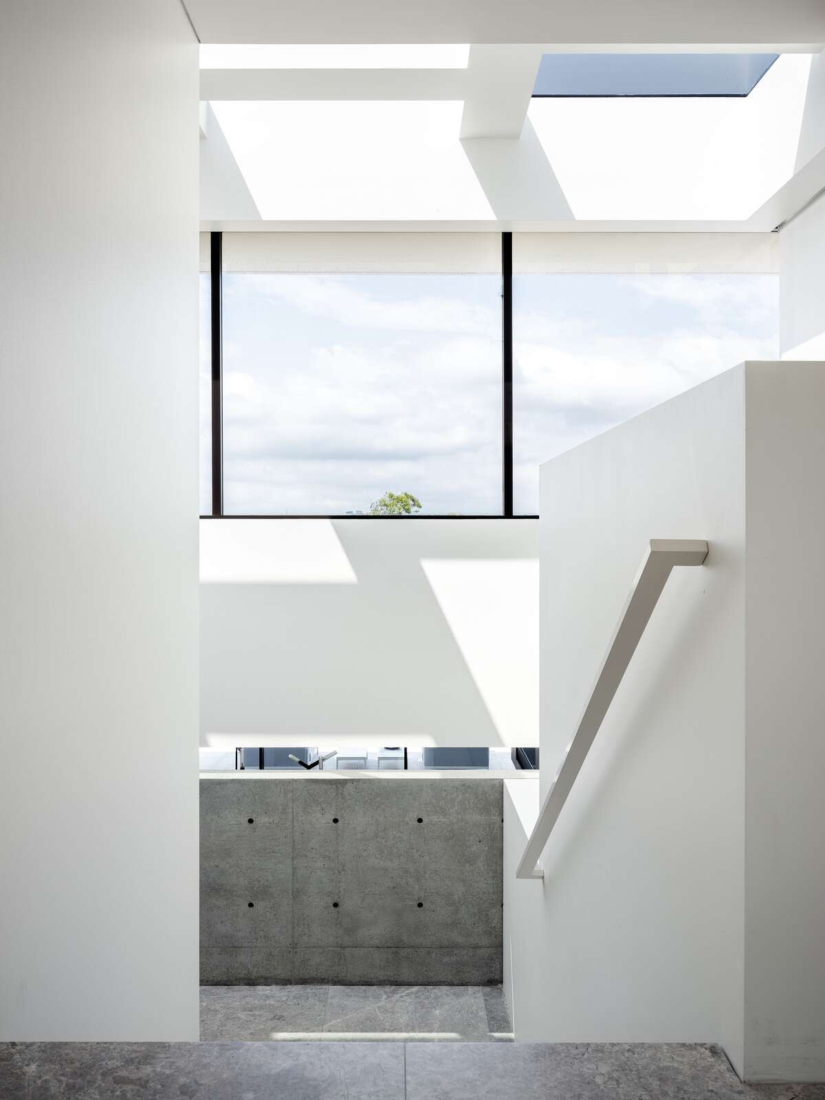 Each level slightly overhangs the next, exaggerating the site’s steep slope as it falls away from underneath the heavily expressed concrete slabs.