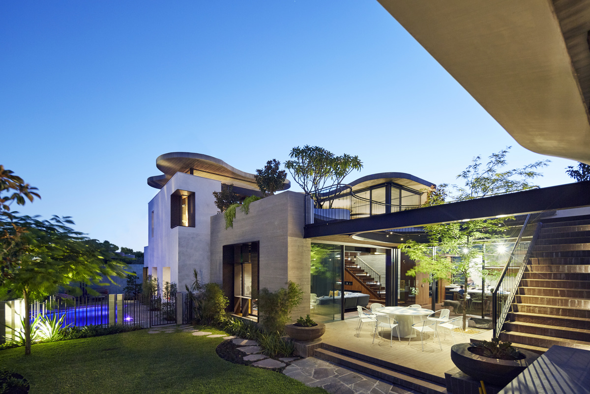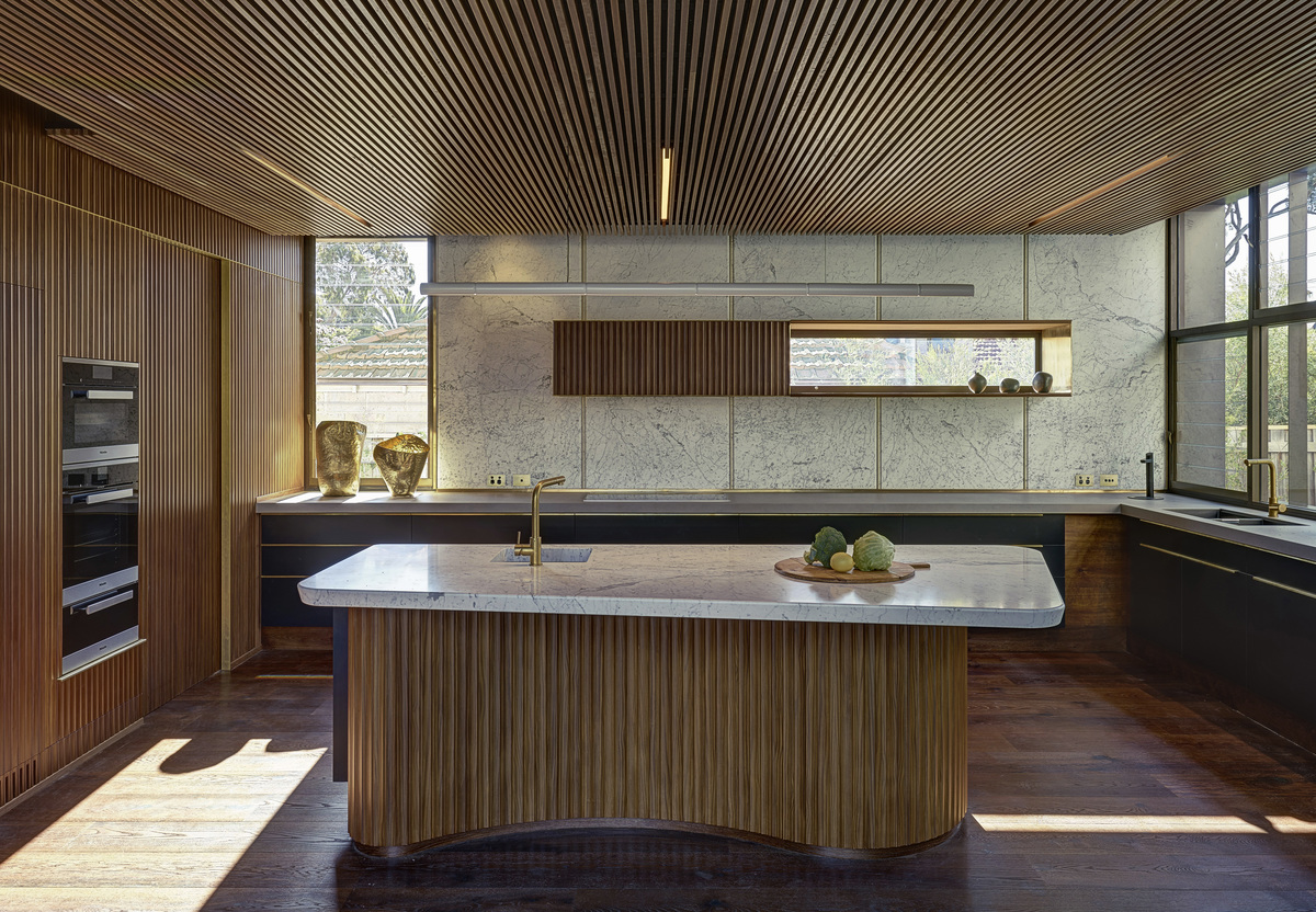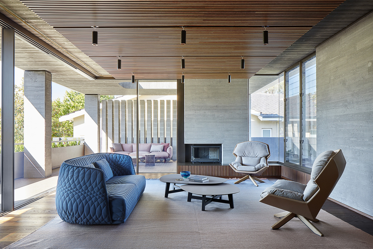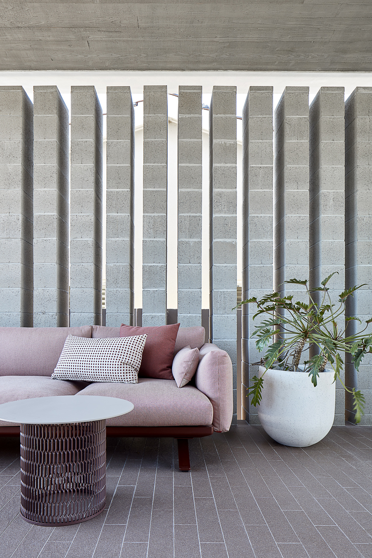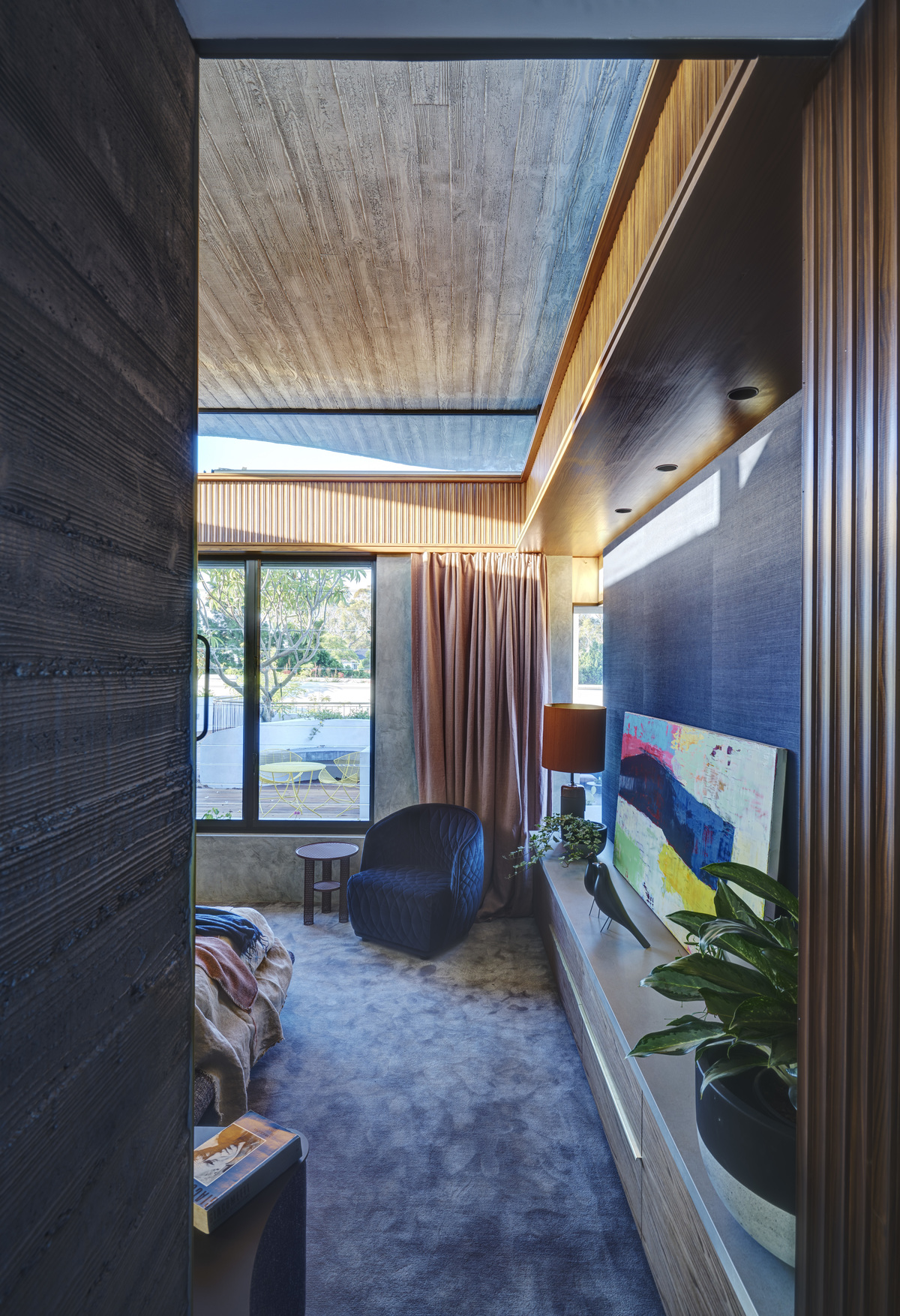 The low slung street-front roof over the living room and dining room has a ‘scooped’ profiled concrete upturn referencing the old City Beach Surf Lifesaving building.