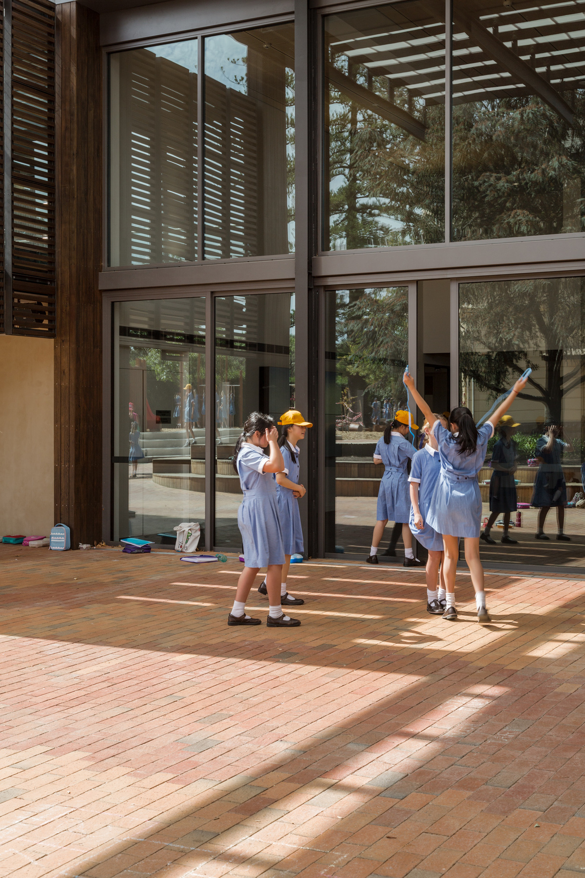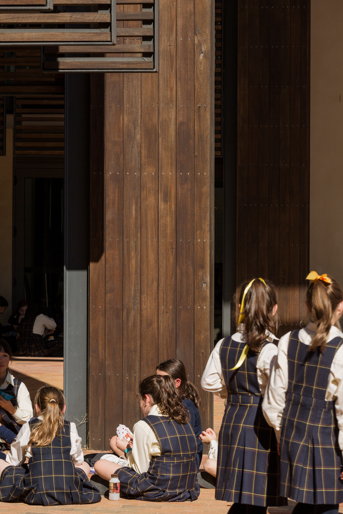 On the east side, students spill out to a partially covered precinct that is part adventure playground /part outdoor classroom. Secret nooks and walkways encourage exploration and pathways lead onto to play equipment designed specifically for the younger girls.
