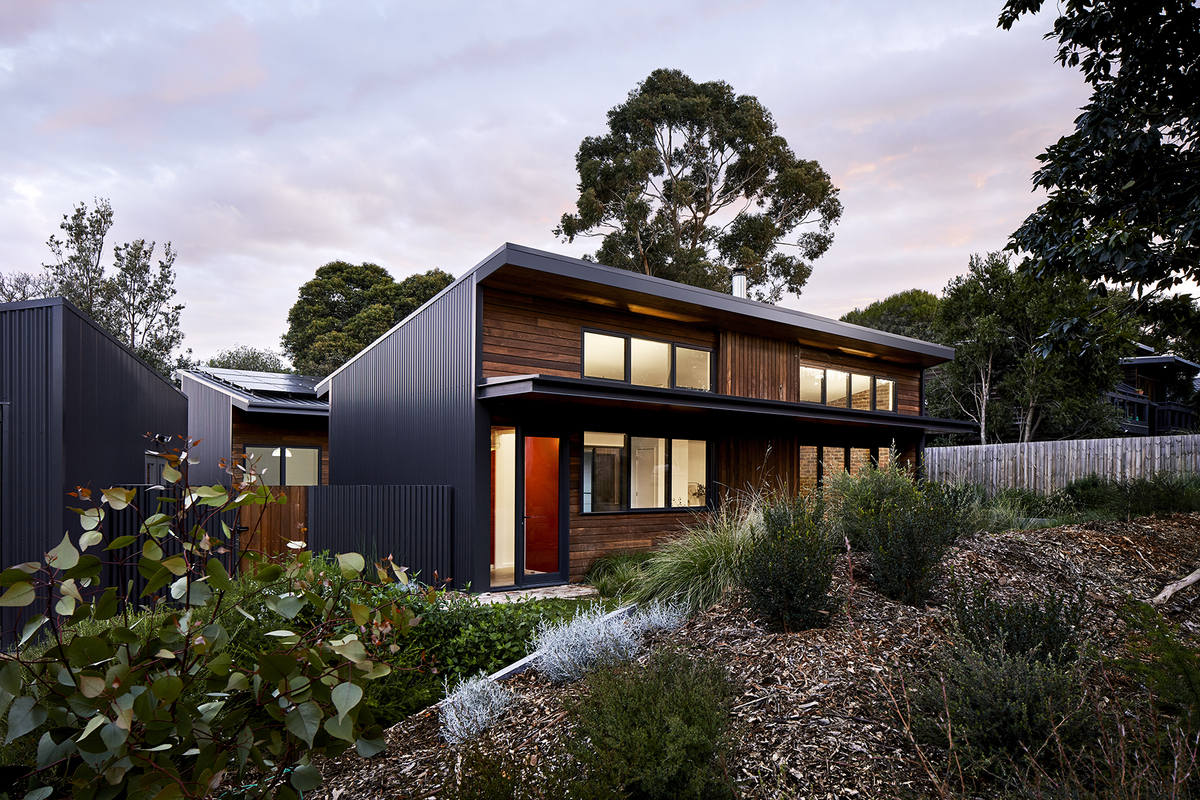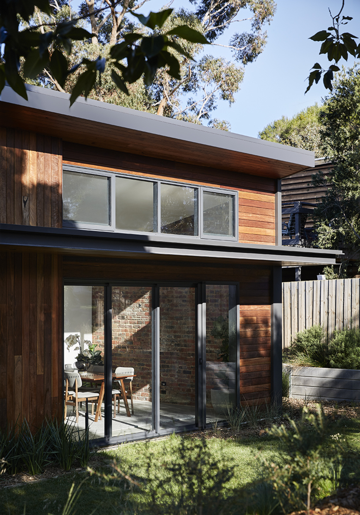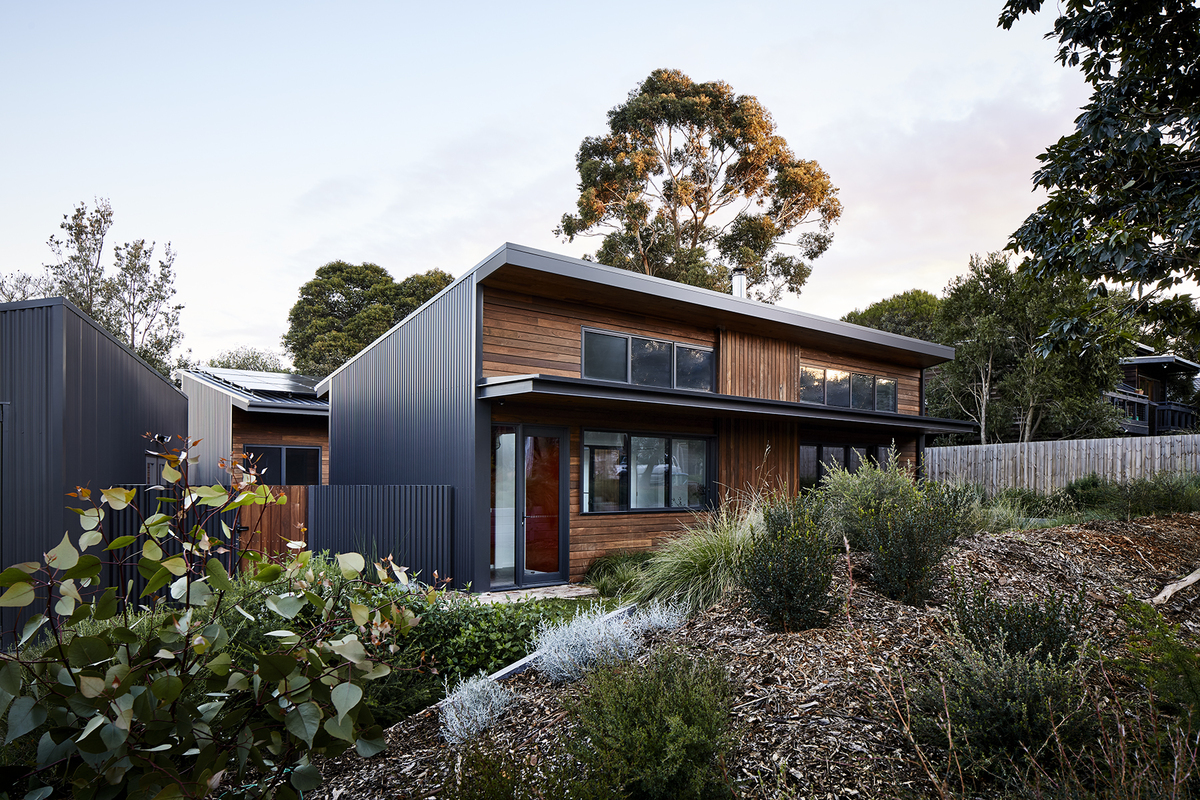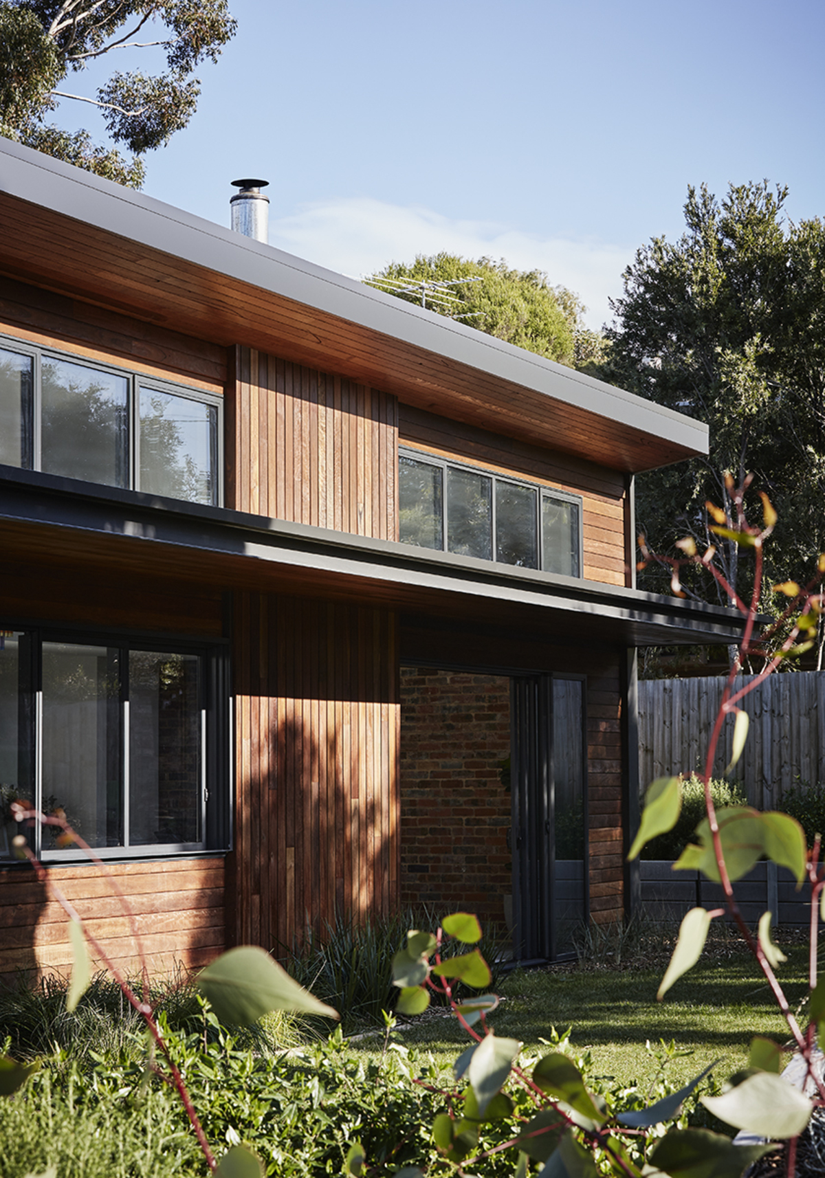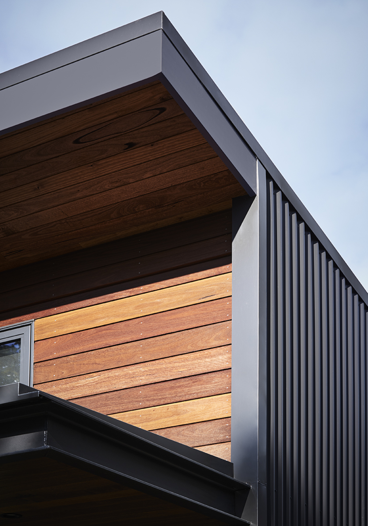 Corrugated iron and timber cladding are both found in typical coastal houses and convey a sense of familiarity with the Mornington Peninsula.