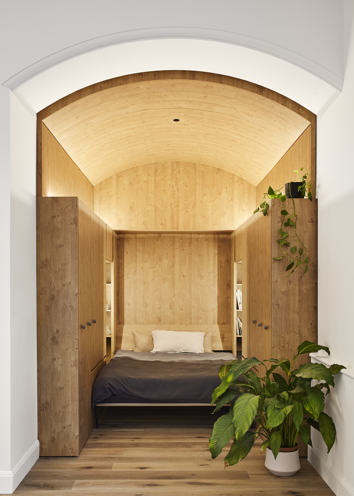 Working with the tight confines of this room, at just 2.6 metres wide, Tsai Design replaced the bulky ceiling with an elegant timber vaulted ceiling embracing the existing arch of the doorway.