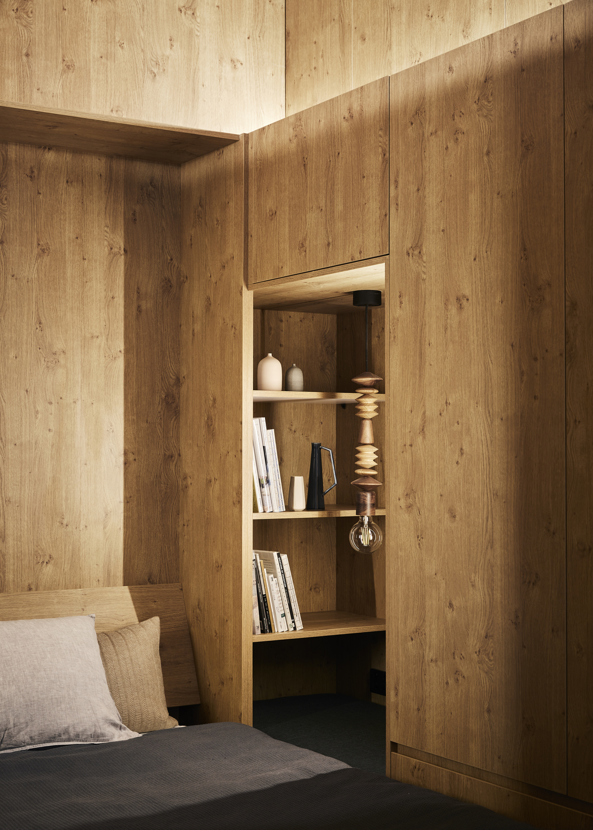 Customisable shelving alcoves either side of the bed head provide perfect access for book and bedding storage and reading lights, and a sense of spaciousness in what could have been a too-tight environment.