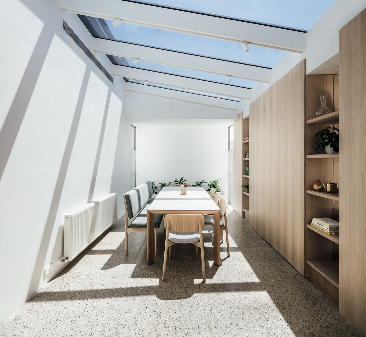 A new wall of timber joinery conceals the existing structure and simultaneously addresses both the dining and the lounge room.