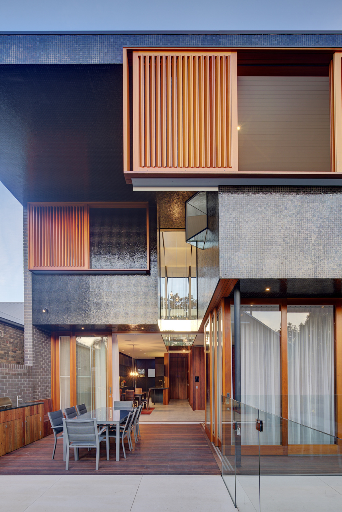The warm, earth tones of this staircase provide a counterpoint to the glossy black exterior tiles, mirror-lined void, and polished concrete floors.