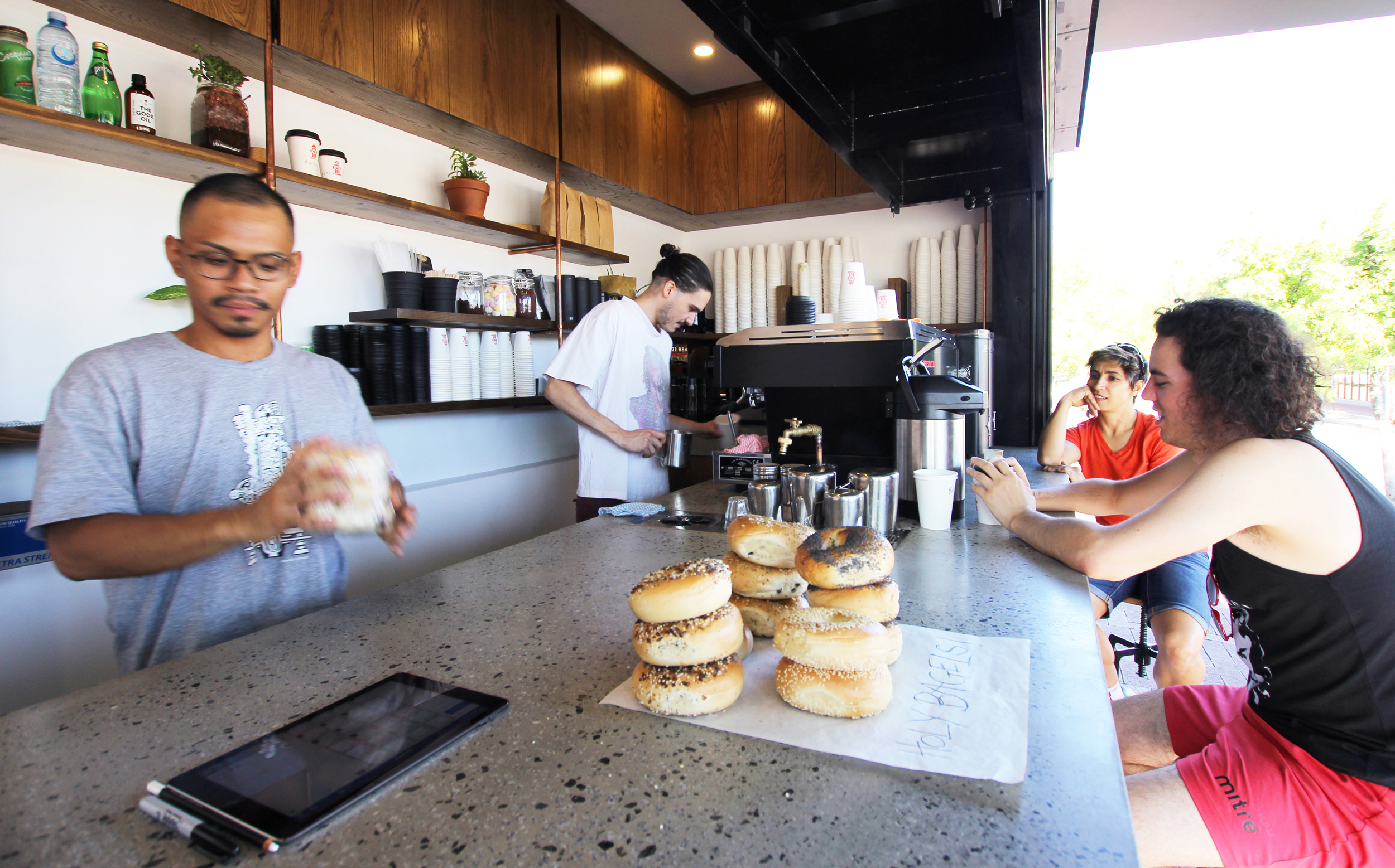 A honed concrete counter, outdoor alfresco area shaded by an existing tree, canopy consisting of a series of folded black aluminium trays, and a mural by local artist Daek William invite passers-by to engage with the tenancy.