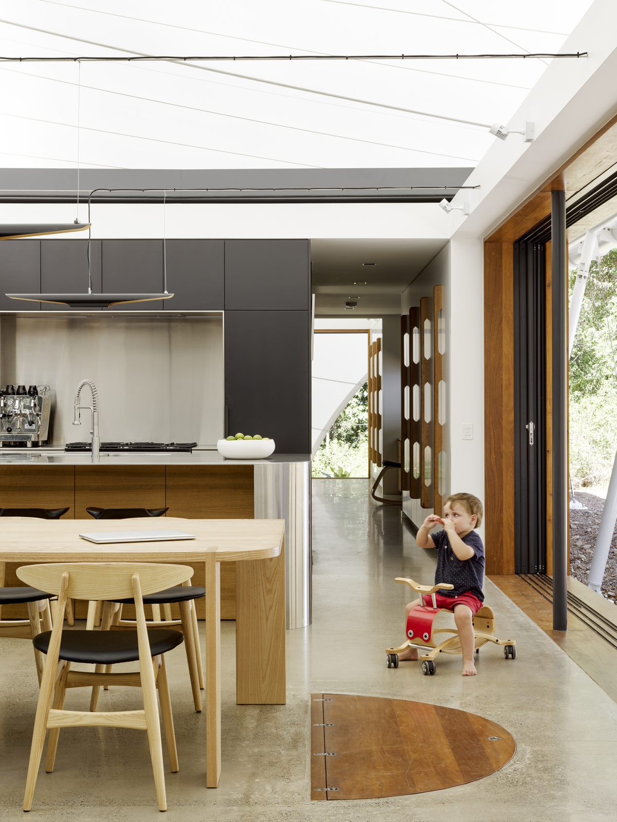 Responding to this and the unique site, the living space feeds to east and west corridors providing bedroom access, and nooks for study, day bed, and storage.