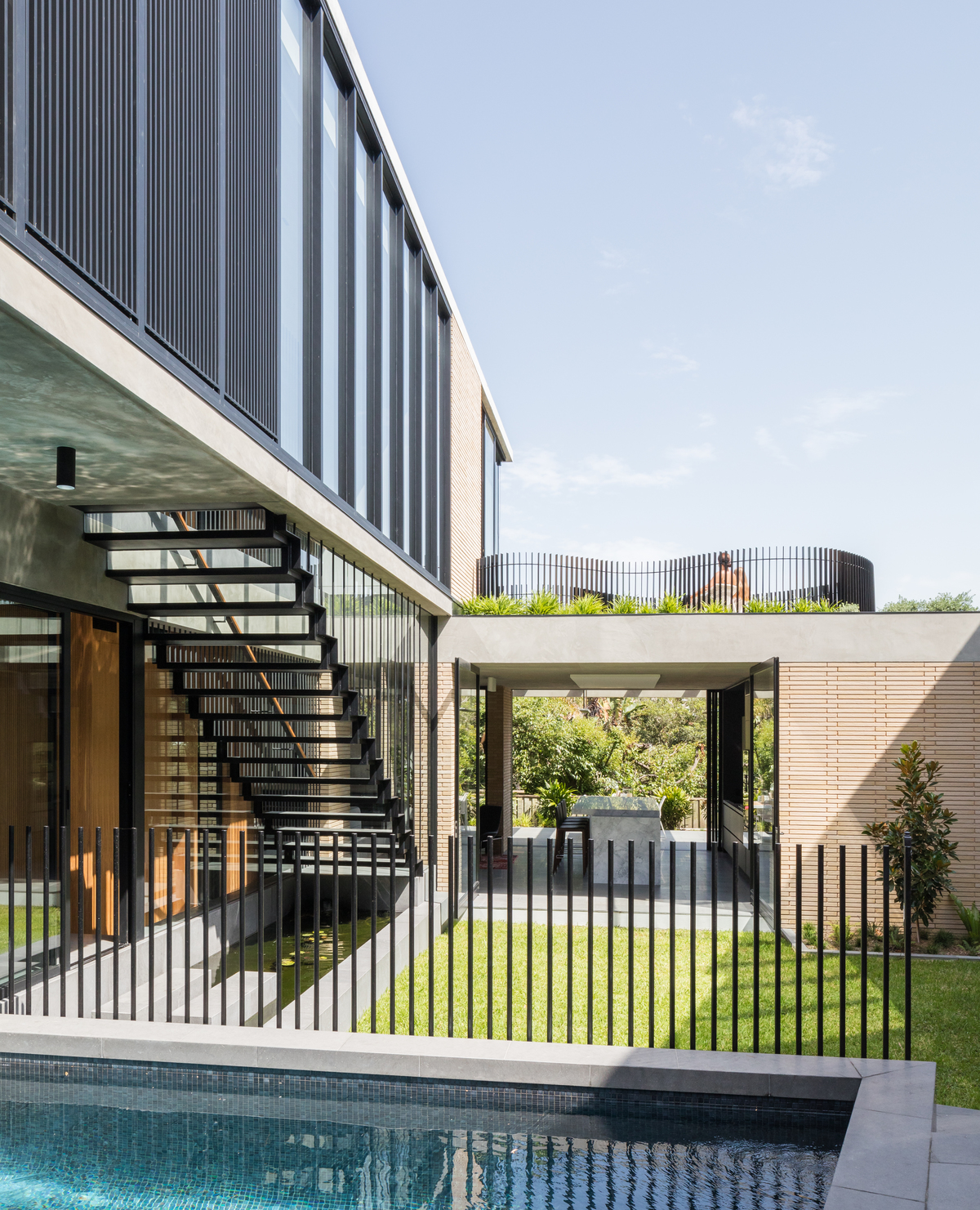 A series of stairways break up the journey while the main glazed central stair is the centrepiece to the house as a light-filled piece of sculpture that hangs above a reflecting pond with pool beyond.