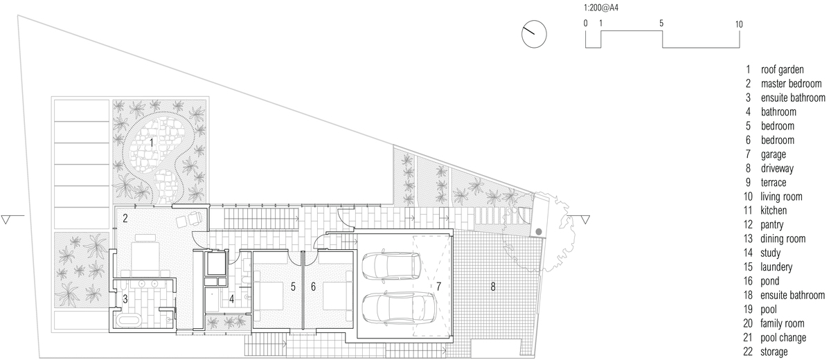 At first floor level, the garage and bedrooms are composed in a linear block perpendicular to the street.