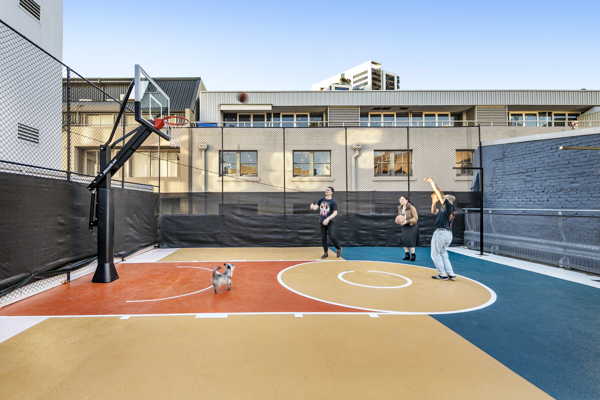 Housing a variety of wellness facilities and communal areas, including an entry hub with a coffee bar, an internal meditation garden, a yoga studio, an outdoor terrace and basketball court, along with shower amenities and library.