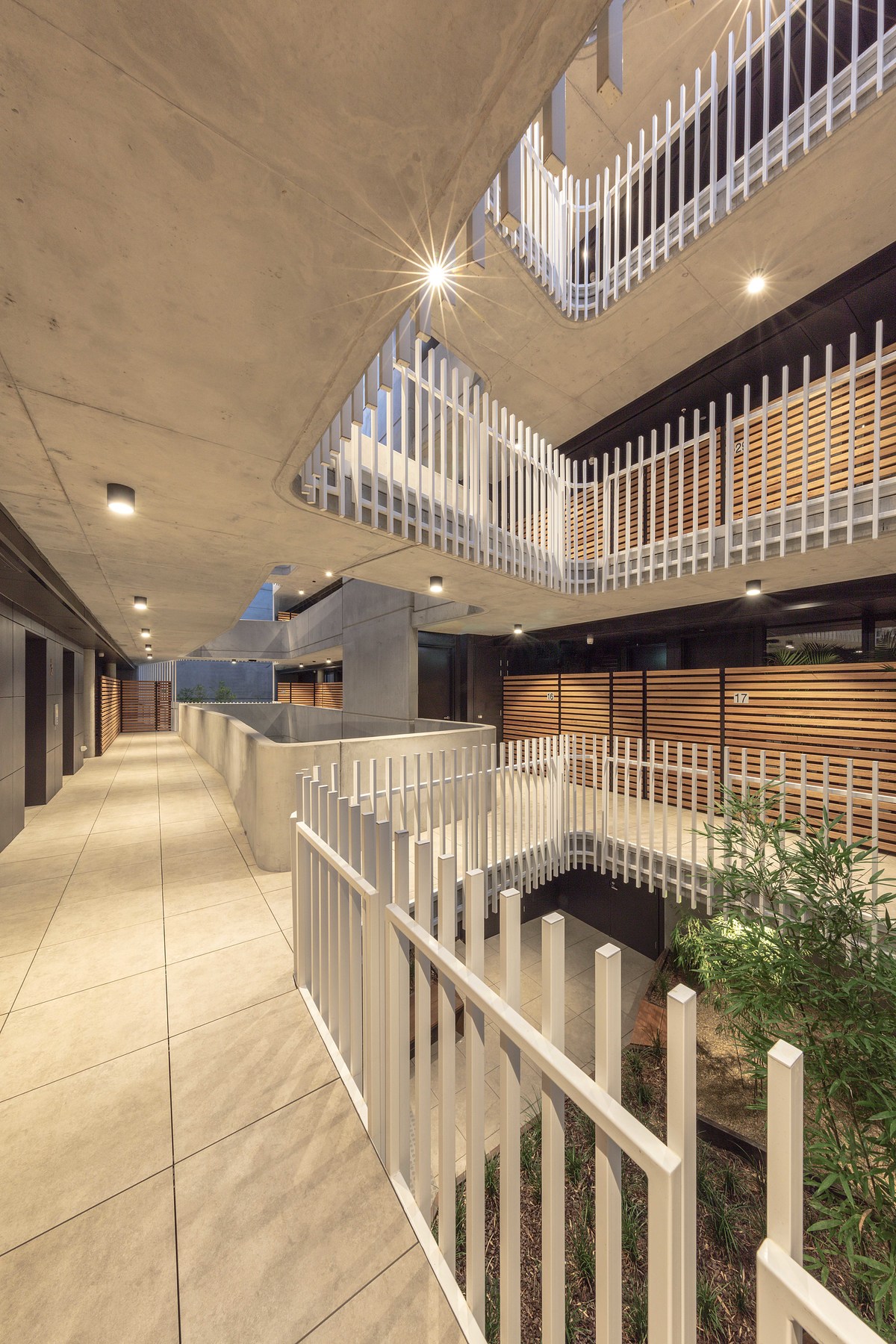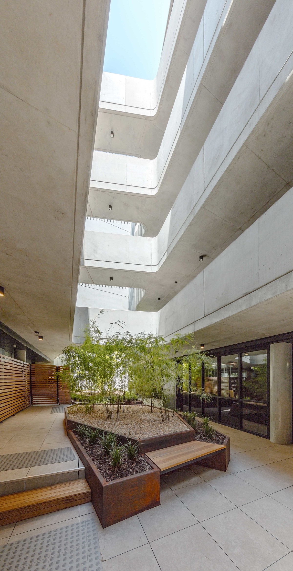 The building was split into two sections on the residential levels, enabling the creation of a dynamic circulation space that is open to the sky.