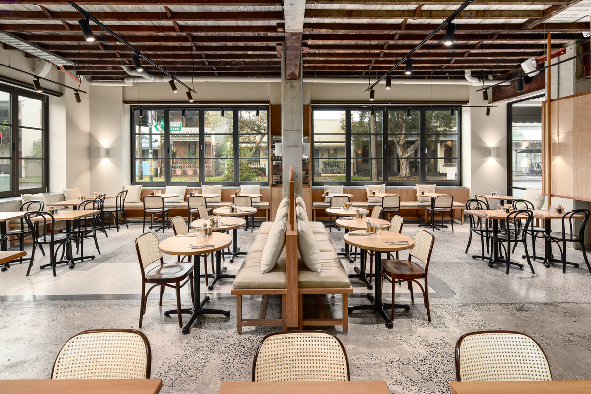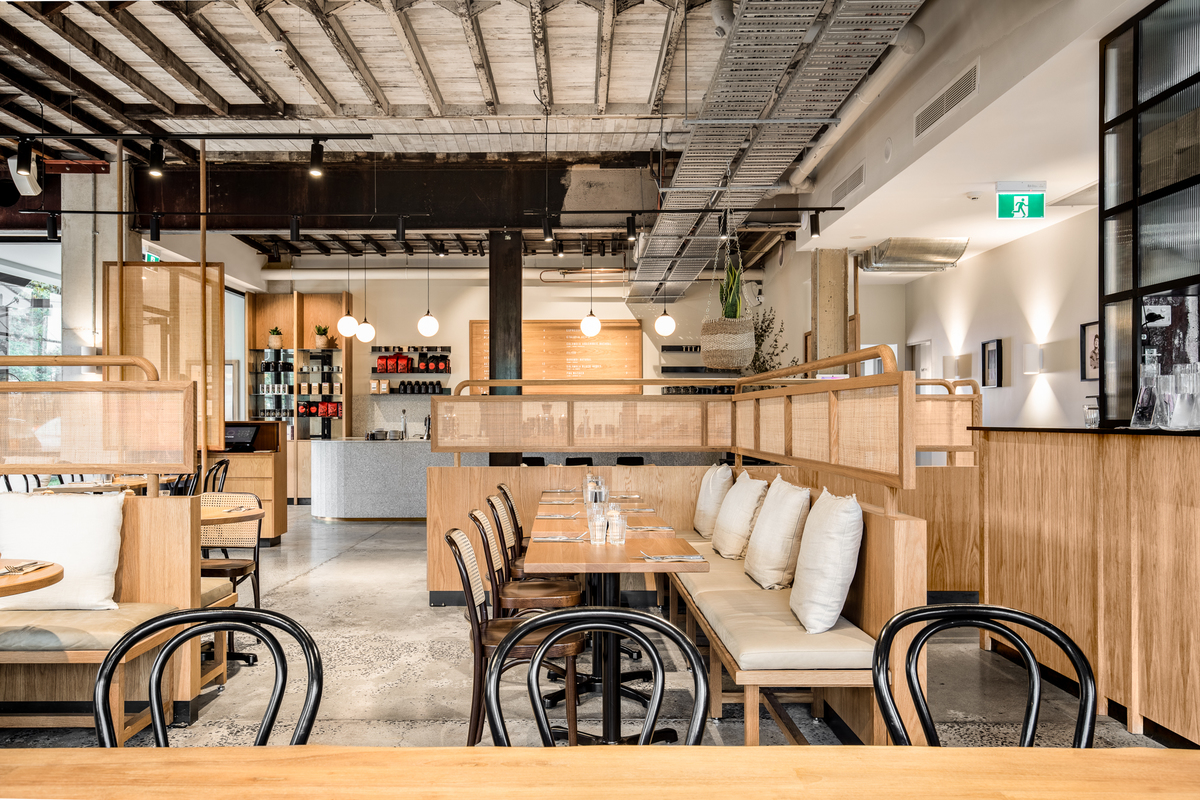 In the seating area, light brown wooden tones and cane webbing created a warm and inviting space in the industrial shell, leaving customers captivated to visit this flagship café.