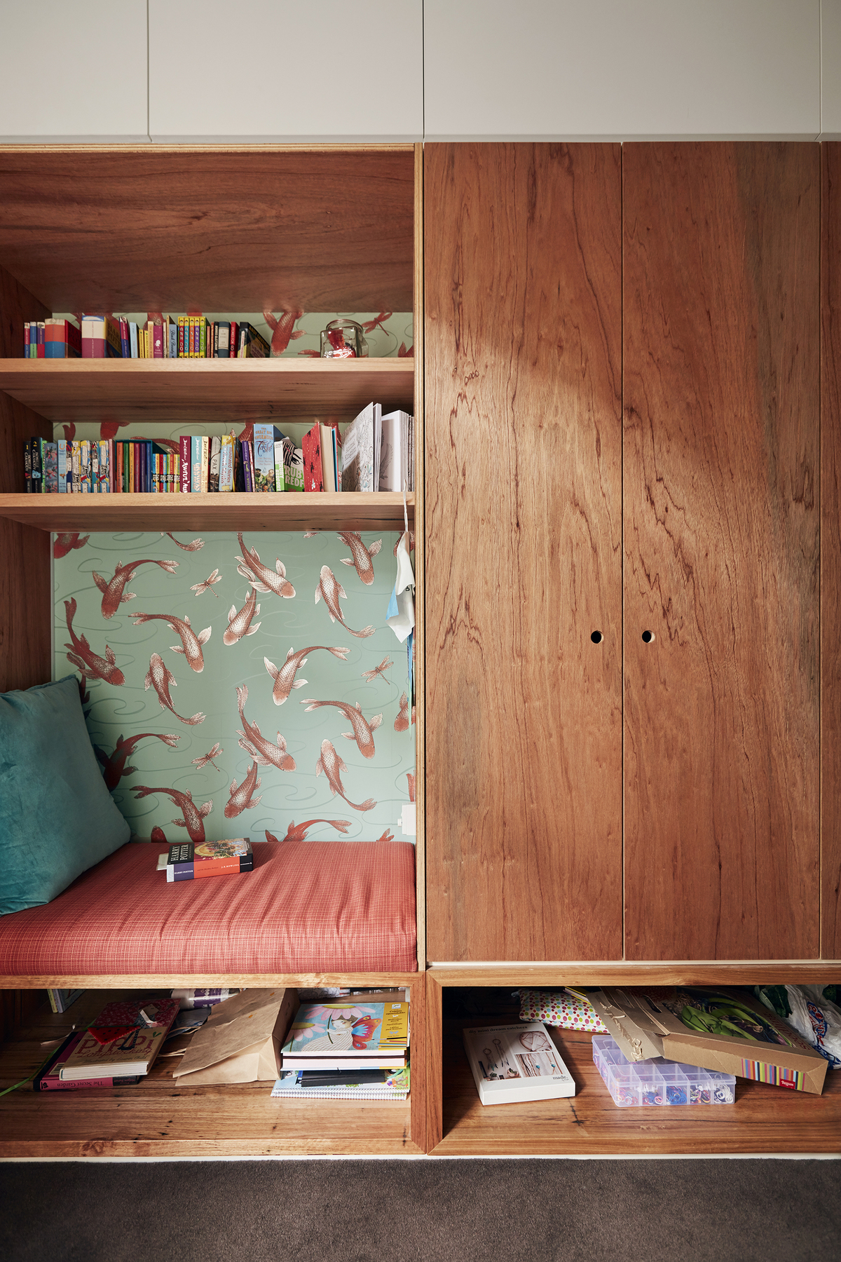 In their bedroom stands a timber pod designed by Architecture Architecture.