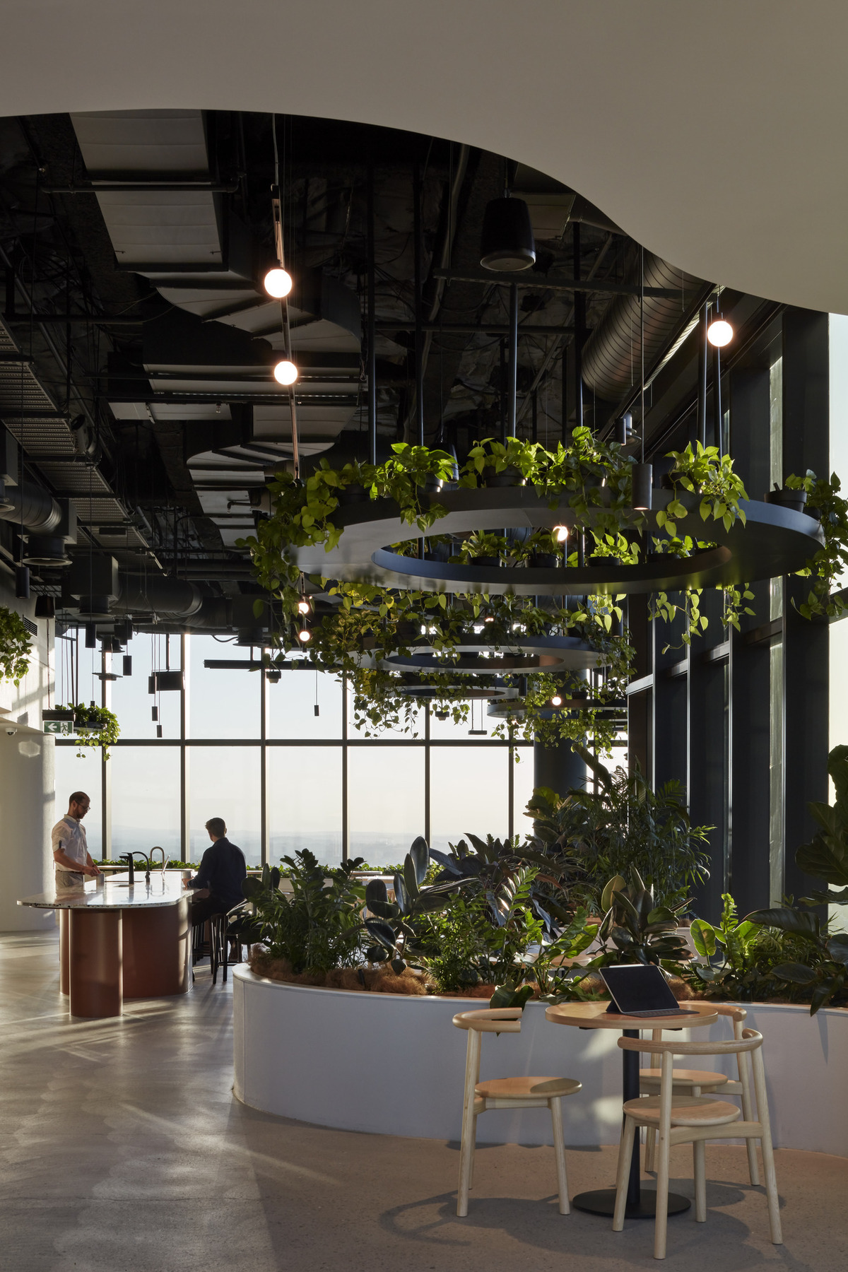 Exposed ceilings are painted dark green with a digital and planted canopy hanging from above.