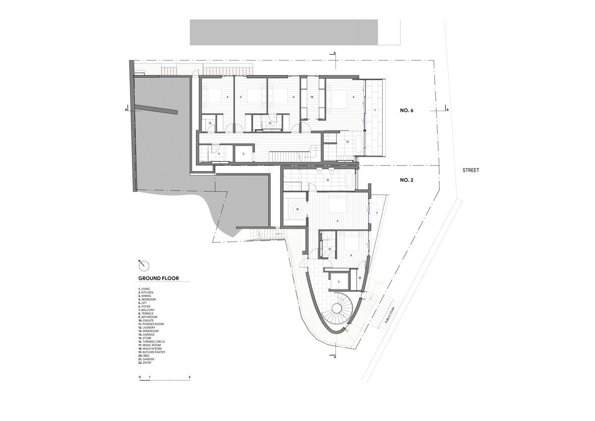 Both houses sit on the solid base of the heritage stone street wall, relieved by the landscaped entry court.