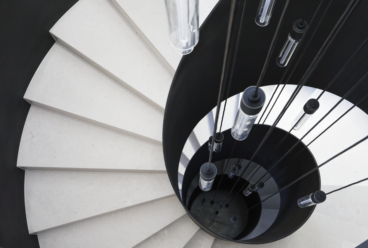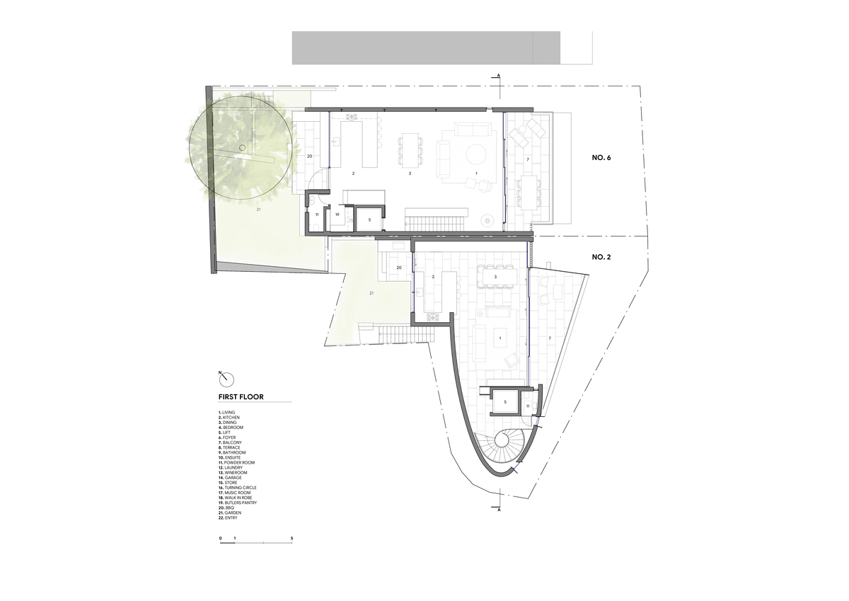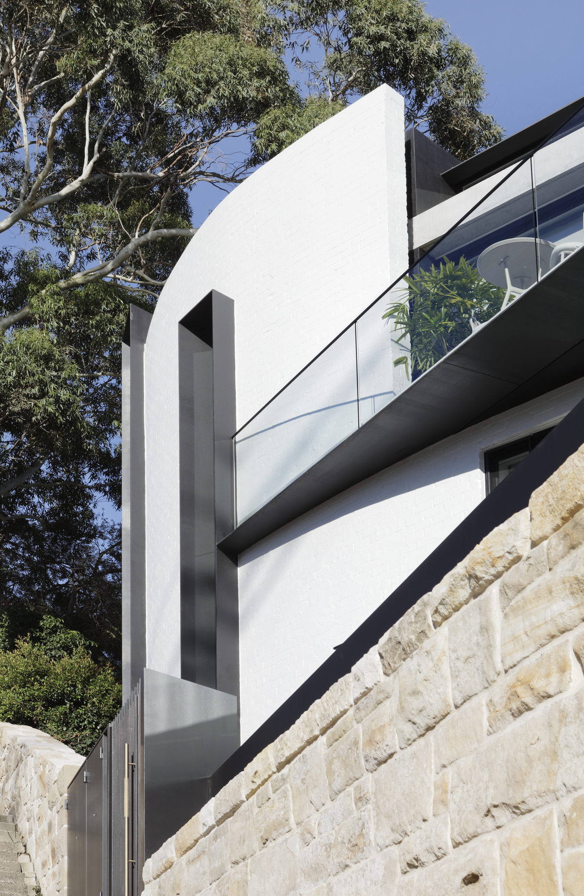 The southern dwelling terminates the streetscape, ending in a tightly curved profile (following the unusual site boundary line), which contains a freestanding steel plate and limestone spiral stair.