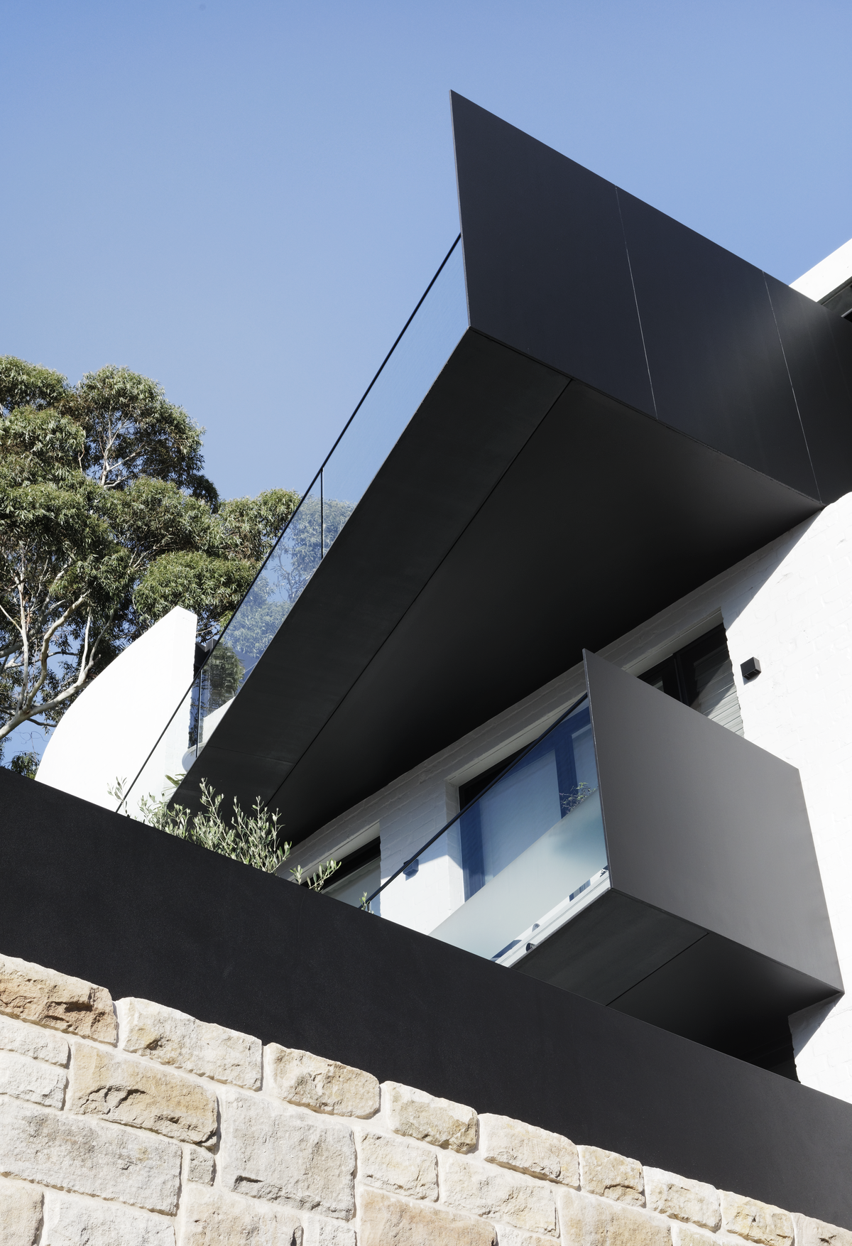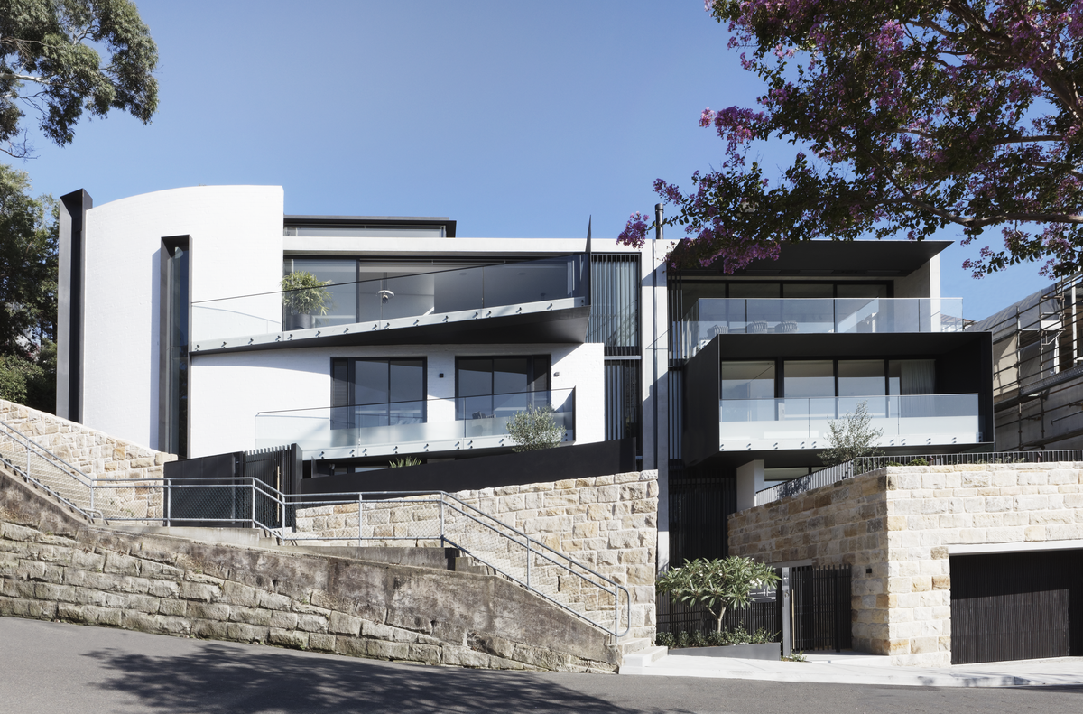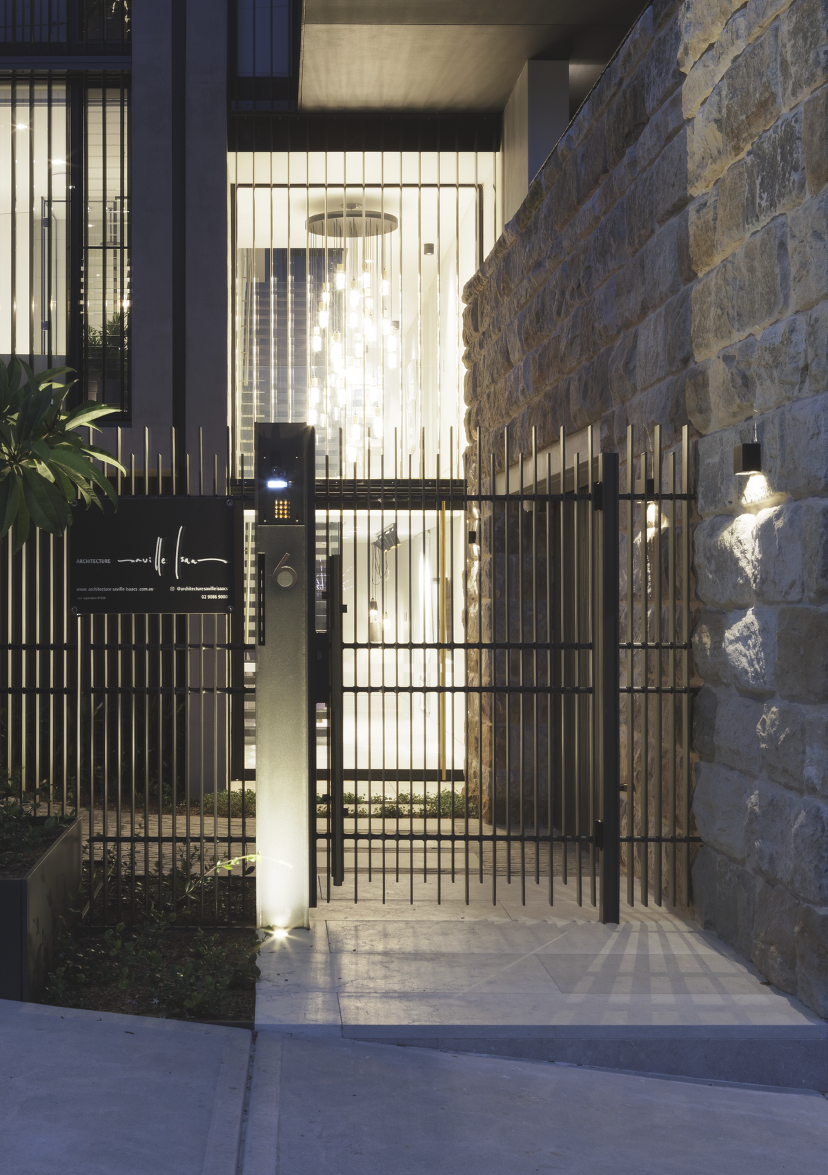 The houses sit on the stone base of the original heritage street wall, penetrated to allow vehicular access (in the location of the old garage) and to create an entry court (in the location of the old stairway).
