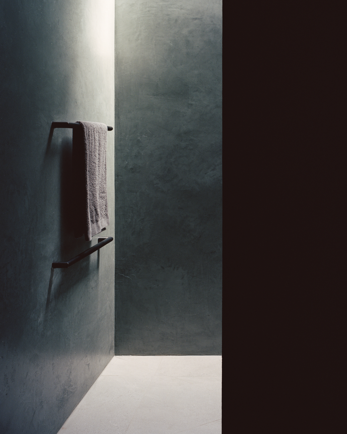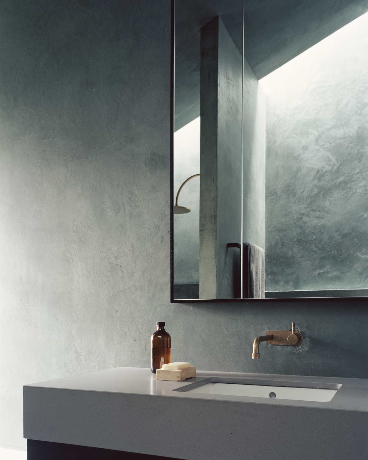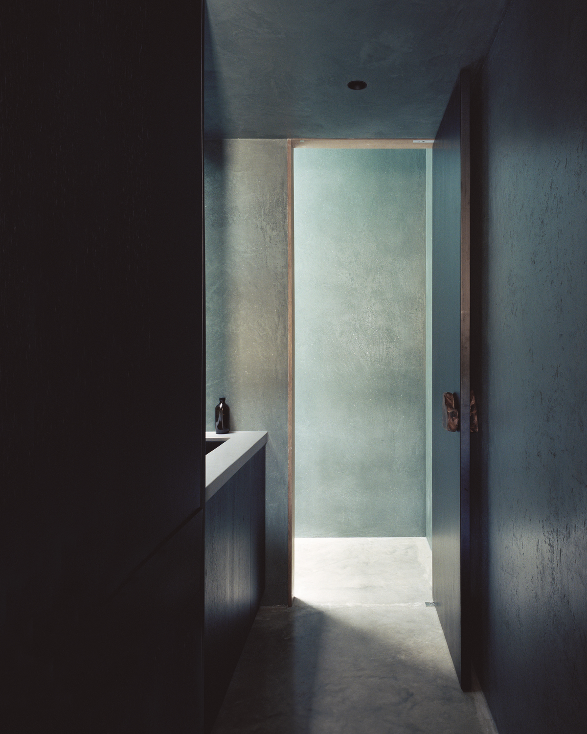 The bathrooms are intentionally located within the building, with low ceilings that release into full height shower spaces, lit by skylights.