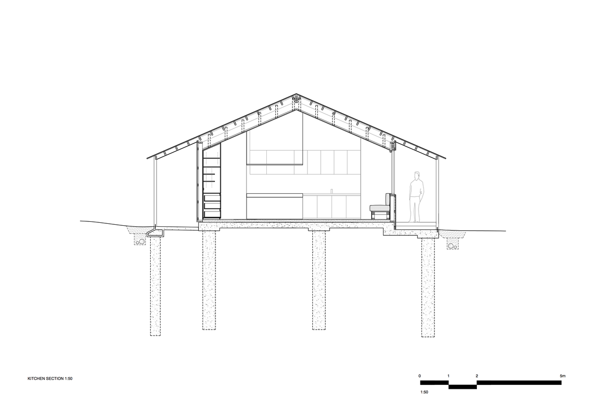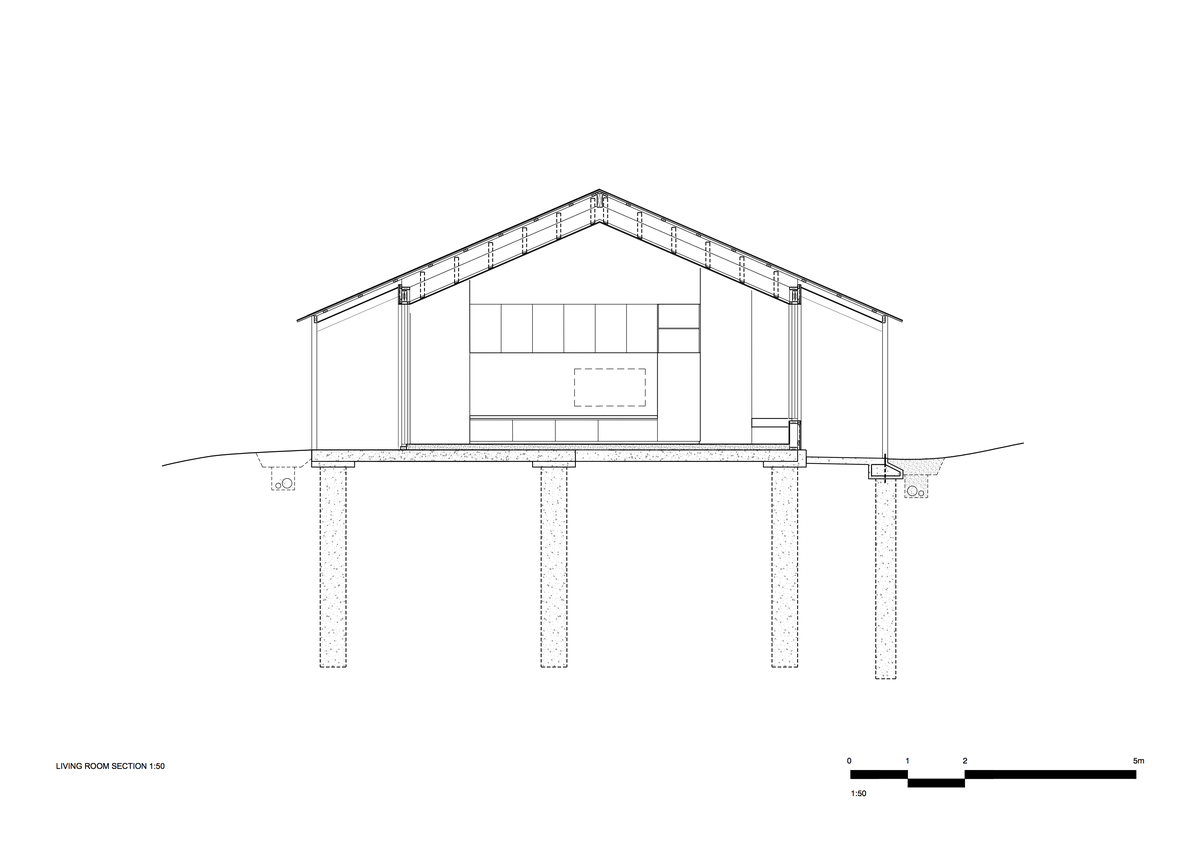Conversely the sleeping shed is divided repeatedly, creating compact bedroom and bathroom spaces, connected via a corridor to the south.