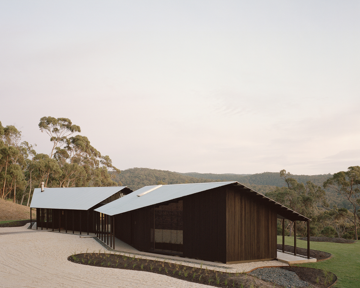 The project uses a minimal material palette and a simple design language drawing from local cottages, agricultural buildings and Australian vernacular.