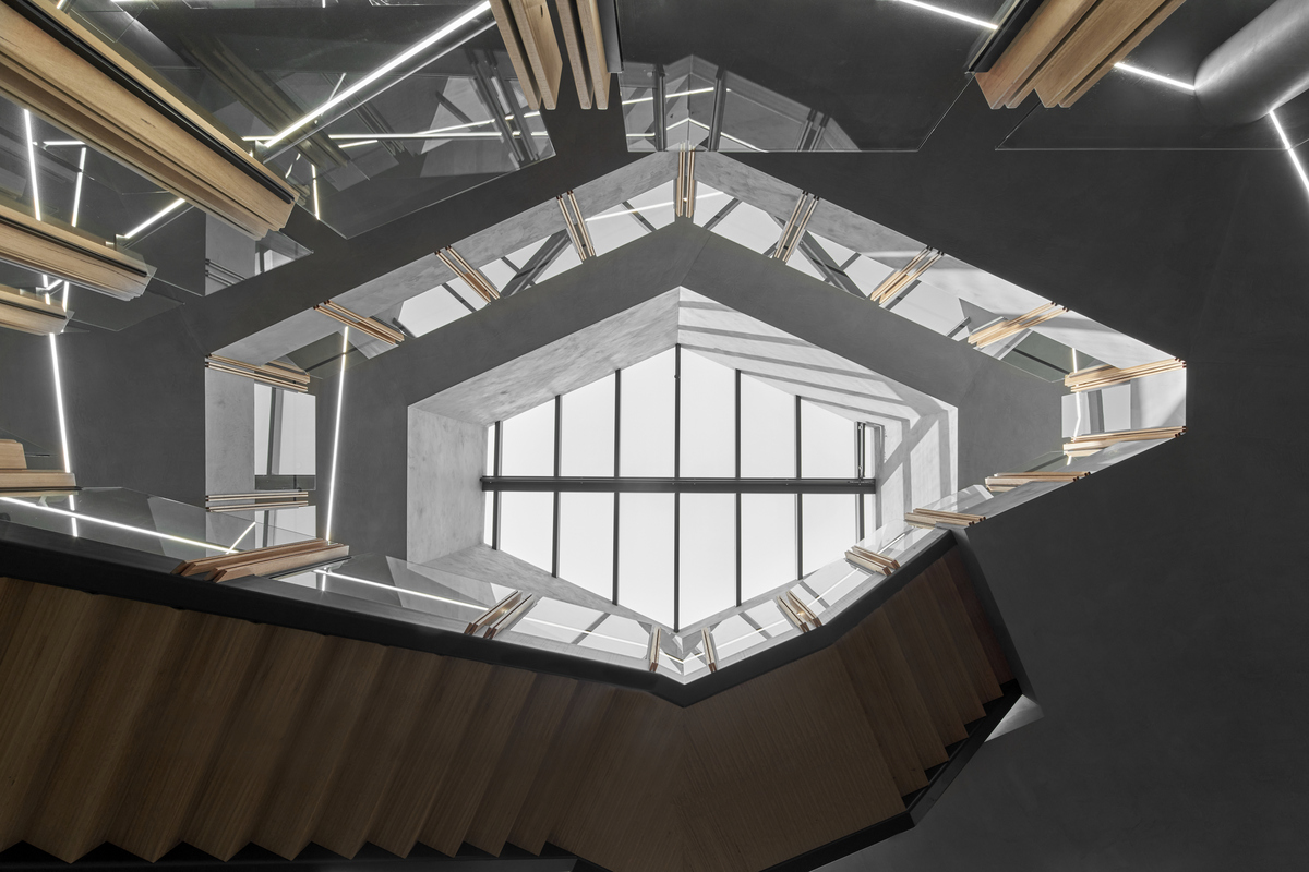 The resulting distinctive architectural language supports a passive environmental strategy to reduce direct solar heat gain.