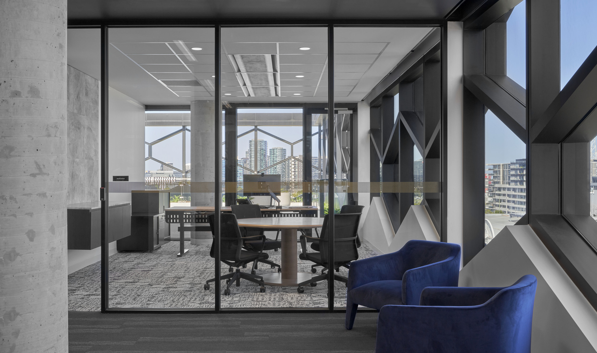 A solid base for the building allows it to sit comfortably within its surrounding context while the glass on the floors above delivers magnificent views across Port Phillip Bay and the Melbourne CBD.